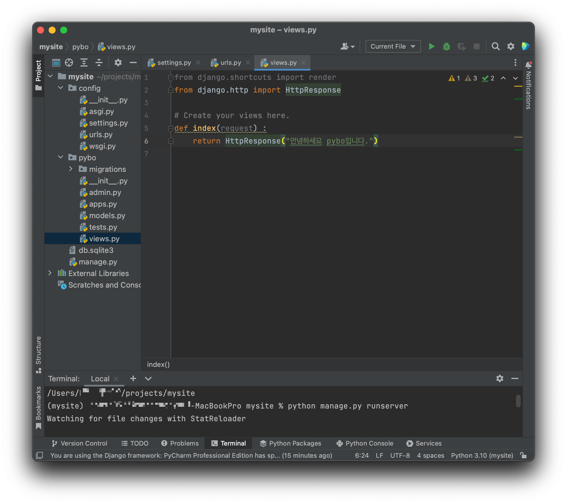 (mysite) stdiohan@stdiohan-MacBookPro mysite % django-admin startapp pybo