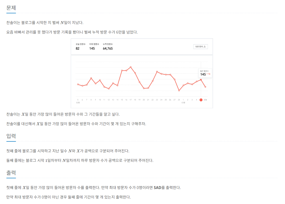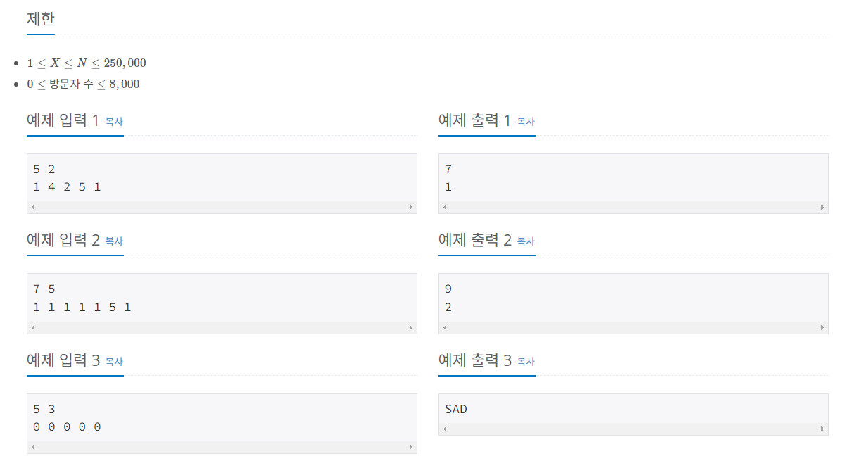첫째 줄에 $X$일 동안 가장 많이 들어온 방문자 수를 출력한다. 만약 최대 방문자 수가 0명이라면 SAD를 출력한다. 만약 최대 방문자 수가 0명이 아닌 경우 둘째 줄에 기간이 몇 개 있는지 출력한다