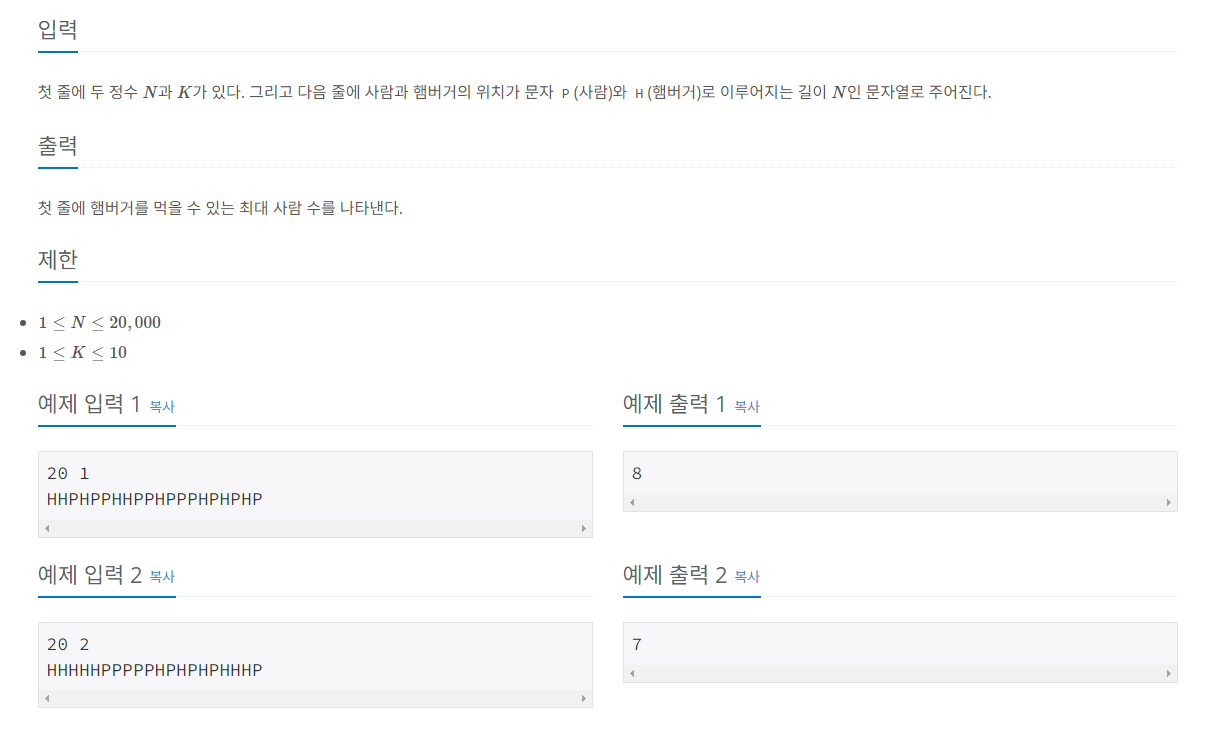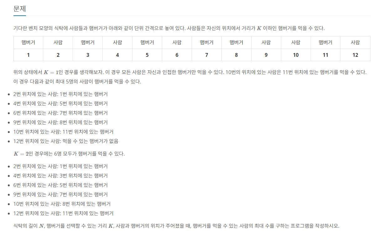 기다란 벤치 모양의 식탁에 사람들과 햄버거가 아래와 같이 단위 간격으로 놓여 있다. 사람들은 자신의 위치에서 거리가 $K$ 이하인 햄버거를 먹을 수 있다. 햄버거 사람 햄버거 사람 햄버거 사