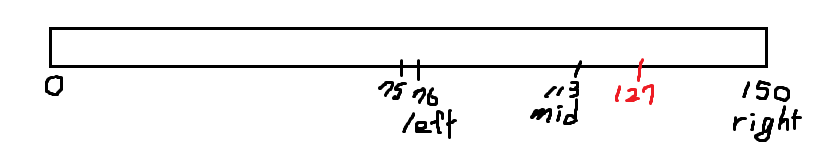문제를 예로들면 문제의 정답은 127인데 해당 조건을 향해 left 와 right 값을 조정해 나아가는것이다. 처음 left 값은 0 right 값은 150으므로 mid는 75이다.
