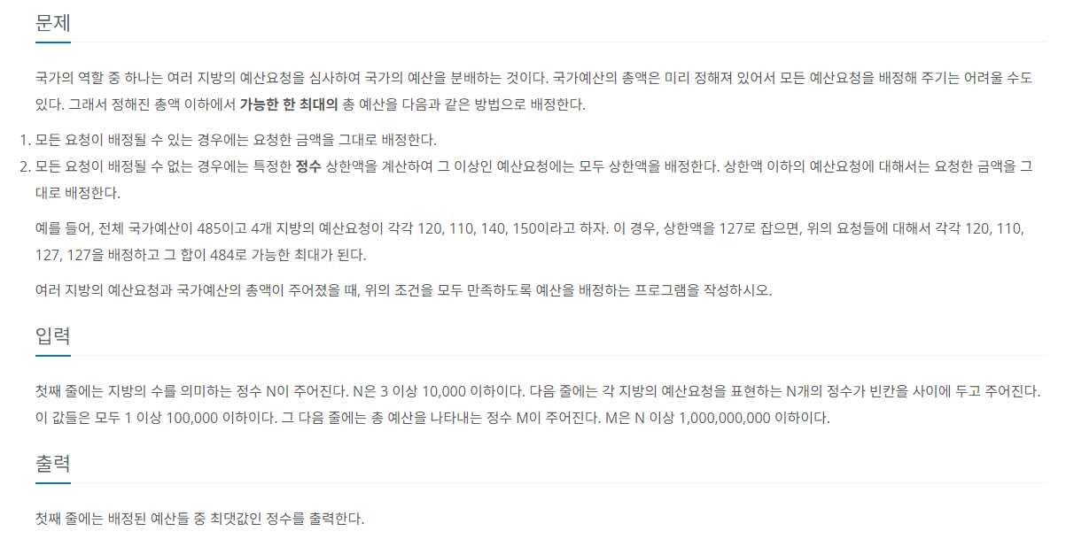 이런식으로 mid가 해당조건을 넘어서지 못하면 left를 mid + 1로 변경하고 해당조건을 넘어가버리면 right를 mid -1로 설정해나아가면 범위를 좁히는 것이다. 이 문제에서 중요한 점은 해당 지방마다 예산의 한도가 정해져 있기때문에 각 지방의 예산 한도를 넘어서지 않게 주의해야한다. 아래 코드처럼 mid가 해당 지방의 예산보다 작을경우에는 mid를 budget에 추가해주고 지방의 예산을 넘어설 경우에는 해당 지방의 최대예산을 추가해준다.