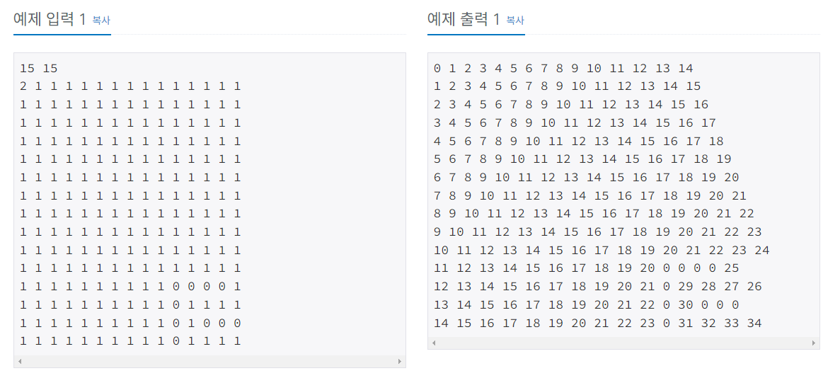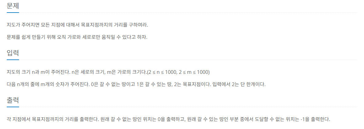 지도의 크기 n과 m이 주어진다. n은 세로의 크기, m은 가로의 크기다.(2 ≤ n ≤ 1000, 2 ≤ m ≤ 1000) 다음 n개의 줄에 m개의 숫자가 주어진다. 0은 갈 수 없는 땅이고 1은 갈 수 있는 땅, 2는 목표지점이