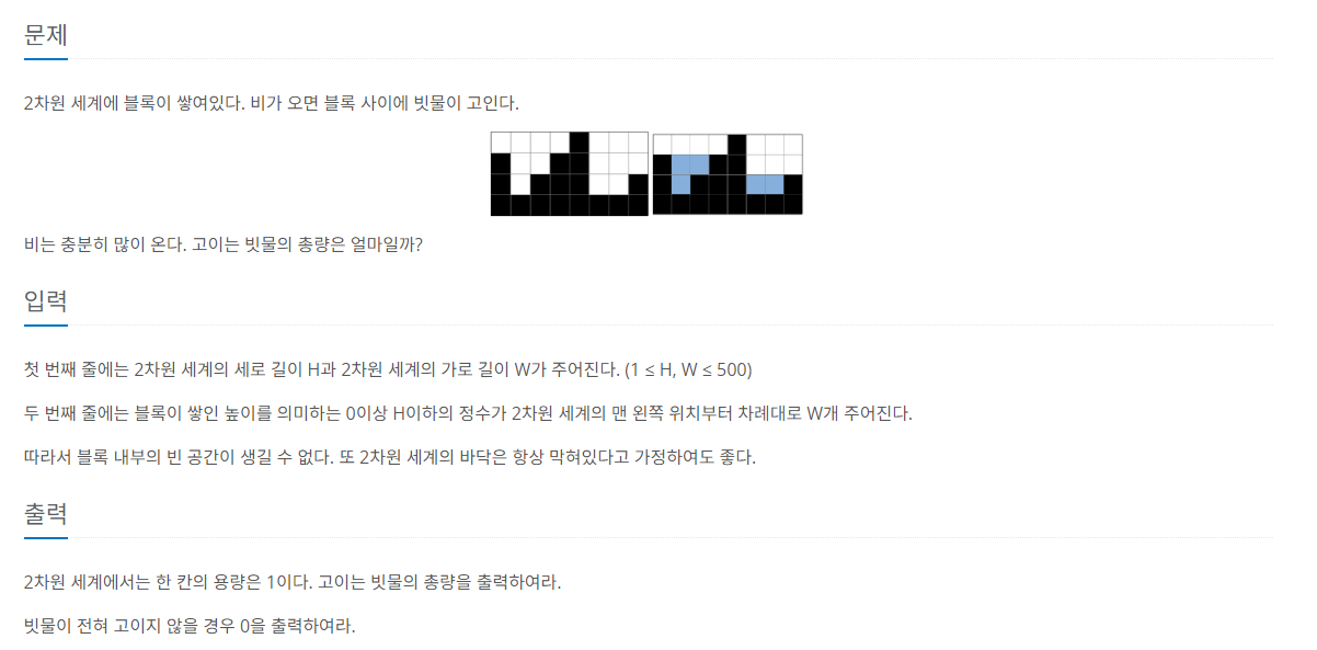 문제 풀이방법은 for문을 돌며 현재 벽 기준으로 왼쪽 벽 중 가장 높은벽과 가장 높은 오른쪽 벽을 구한 후, 그 벽들이 현재 벽보다 높을 경우 빗물이 고이기 때문에 높은 벽에서 현재 벽을 빼주면 그 차이 만큼 빗물이 쌓인다.