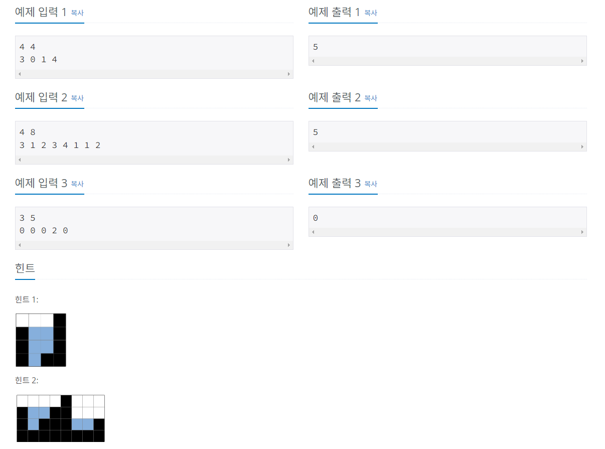 첫 번째 줄에는 2차원 세계의 세로 길이 H과 2차원 세계의 가로 길이 W가 주어진다. (1 ≤ H, W ≤ 500) 두 번째 줄에는 블록이 쌓인 높이를 의미하는 0이상 H이하의 정수가 2차원 세계의 맨 왼쪽 위치
