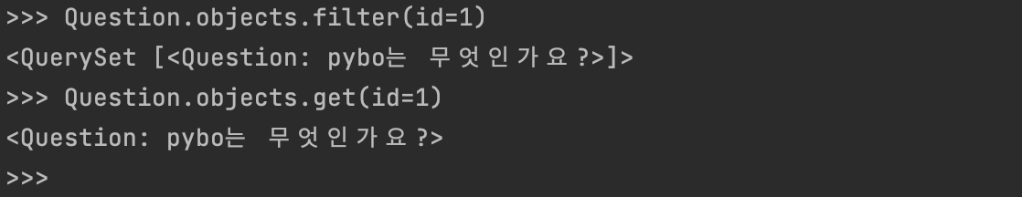 id 값은 유일한 값이기 때문에 get 함수를 이용해도 비슷한 결과를 얻을수 있다. 하지만 filter 함수는 filter함수에 맞는 여러개가 리턴되기때문에 QuerySet 이 리턴된다. get 함수는 Question 모델 객체가 리턴된다. get 함수는 조건에 맞는 데이터가 1개일 경우일때 사용한다. 데이터가 여러개일때 get 함수를 사용하면 오류가 난다. 보통 get 함수는 id 와 같은 유일한 값으로 조회할 경우에만 사용한다.