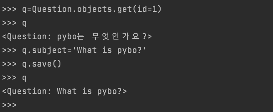 id 값이 1인 데이터를 q 에 초기화후 subject 속성을 수정후 저장한후 q내용을 확인해 보면 변경된 것을 알수있다.