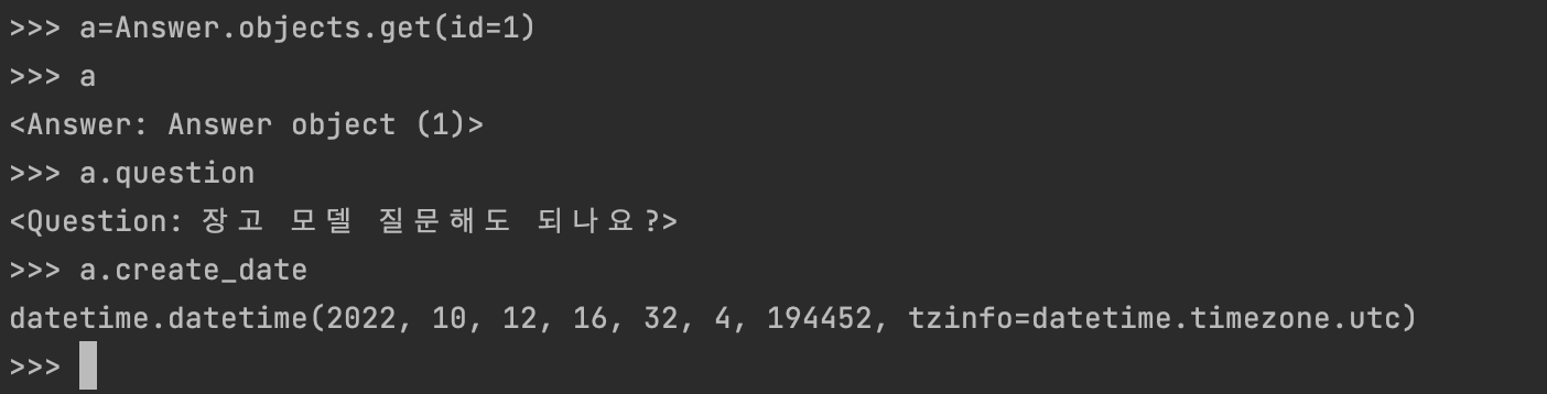 q.answer_set.all() 명령을 하면 질문에 연결된 답변 모두를 가져올 수 있다. Question 모델에는 answer_set이라는 속성은 없지만 Answer 모델에는 Question 모델이 ForeignKey로 연결되어 있기 때문에 q.answer_set 과 같은 접근이 가능하다. 하지만 반대로는 불가능하다. 상식적으로 질문하나에는 여러개의 답변이 가능하므로 q.answer_set 이 가능하지만 답변하나에는 여러개 질문이 있을수 없으므로 a.question_set 은 불가능하다. 답변하나에는 질문 하나만 가능하기 때문에 a.question 만 가능하다.