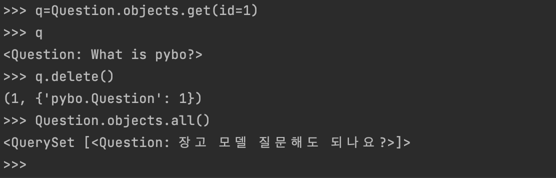 q 에 id 값이 1인 데이터를 초기화후 q.delete() 하면 (1, {'pybo.Question': 1}) 이 출력된다. 이는 Question 모델이 1개 삭제 되었다는것을 의미한다. 그후 질문 모델 전체를 조회해보면 질문이 삭제되고 하나만 남은것을 알 수 있다.