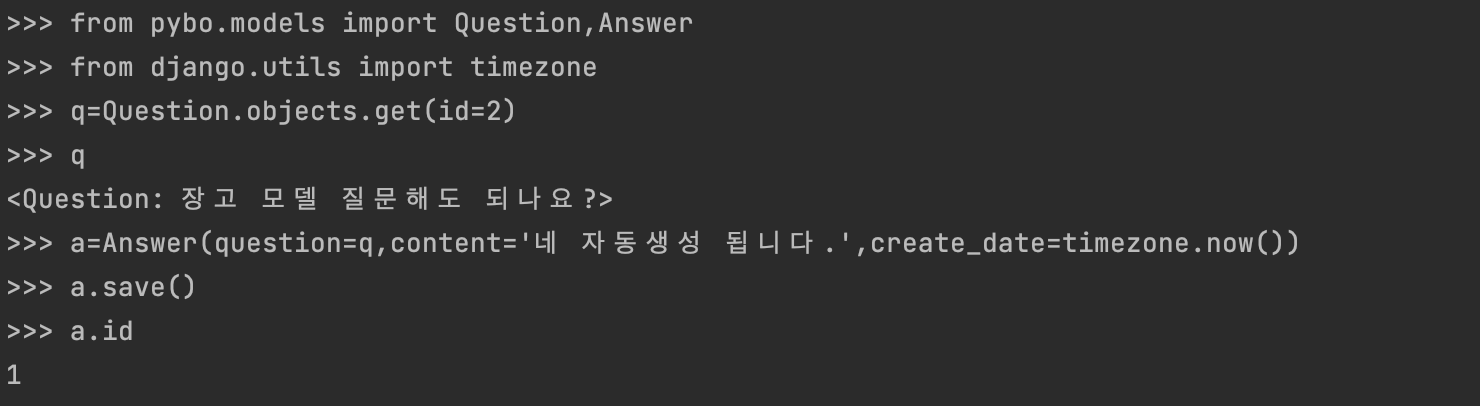 q에 id값이 2인 Question 데이터를 넣고, a에 Answer 데이터를 작성한후 저장하자. a.id 를 보면 id 가 1이 된것을 볼수있다.