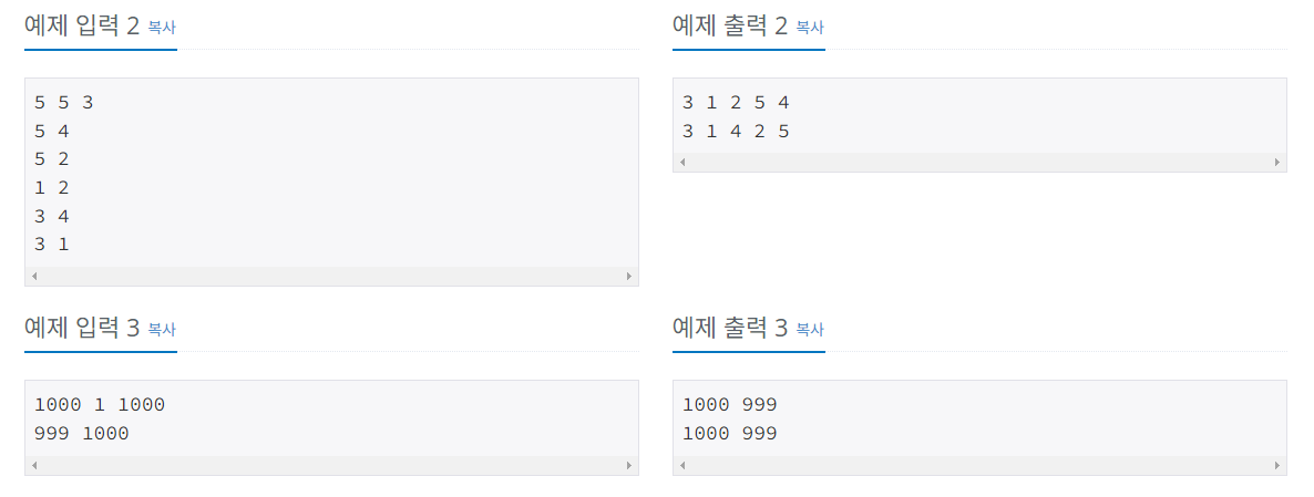 첫째 줄에 정점의 개수 N(1 ≤ N ≤ 1,000), 간선의 개수 M(1 ≤ M ≤ 10,000), 탐색을 시작할 정점의 번호 V가 주어진다. 다음 M개의 줄에는 간선이 연결하는 두 정점의 번호가 주어진다. 어떤 두 정점 사