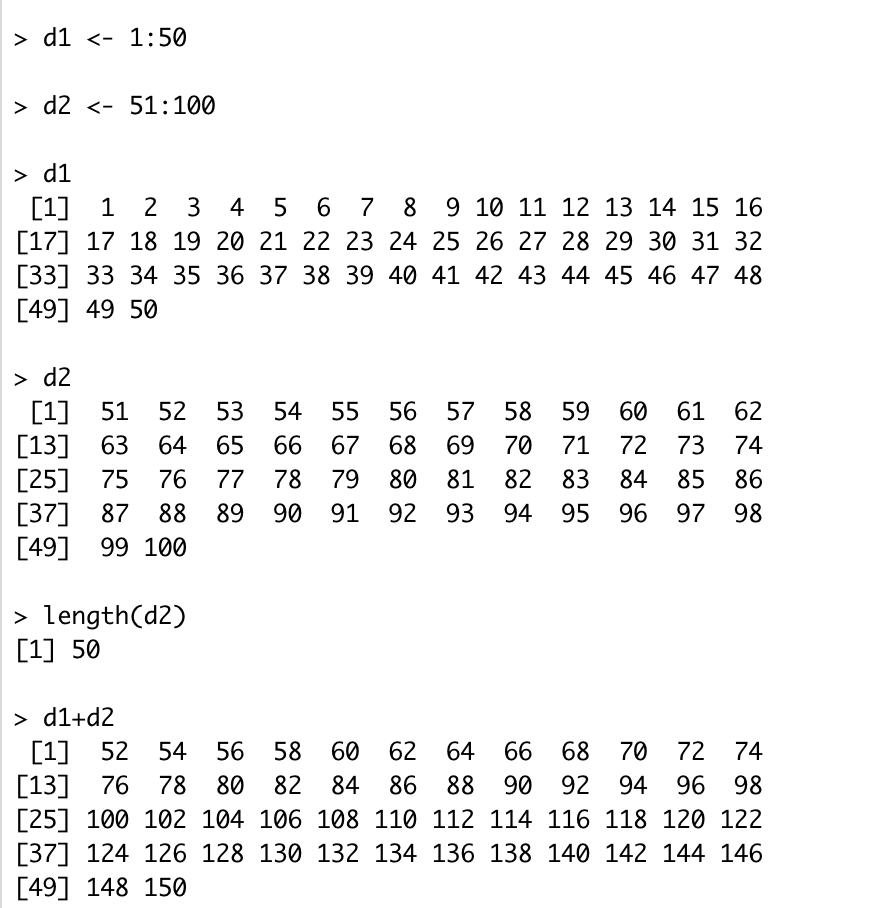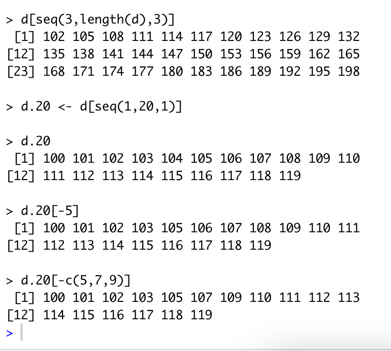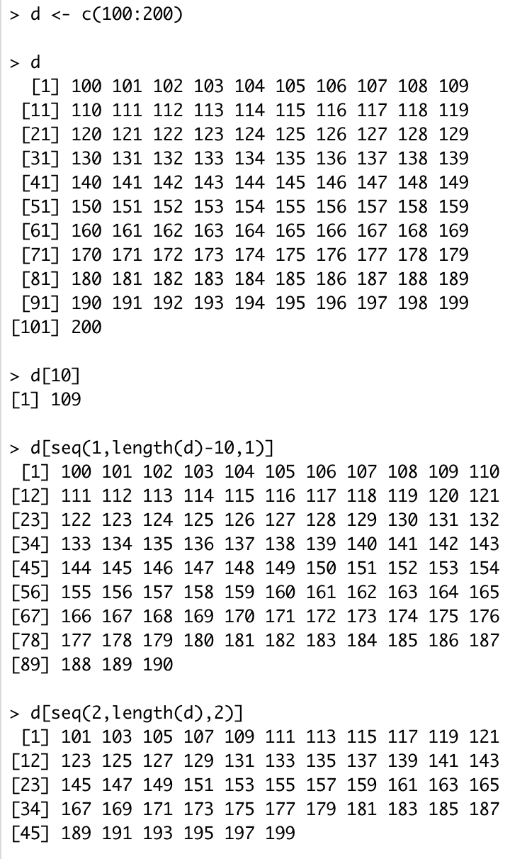 9. 100에서 200으로 구성된 벡터 d를 생성한 다음 각 문제를 수행하는 코드를 작성하고 답을 구하시오.