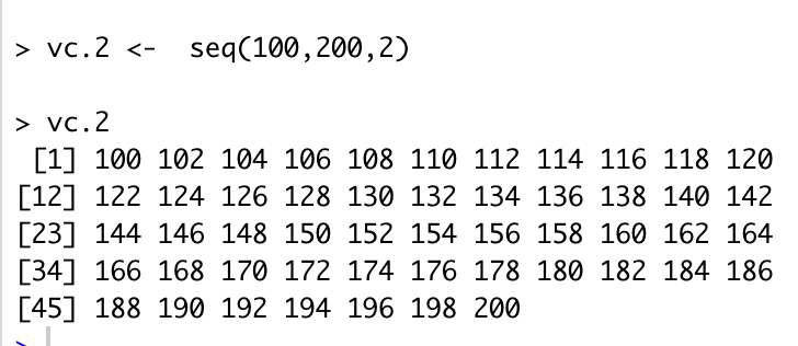 7. 100 ~ 200 사이의 짝수로 구성된 벡터 vc.2를 생성하고 vc.2의 내용을 출력하는 코드를 작성하시오.