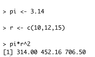 변수 pi에 3.14를 저장한 후 pi를 이용하여 반지름이 10, 12, 15인 원의 면적을 각각 구한다.