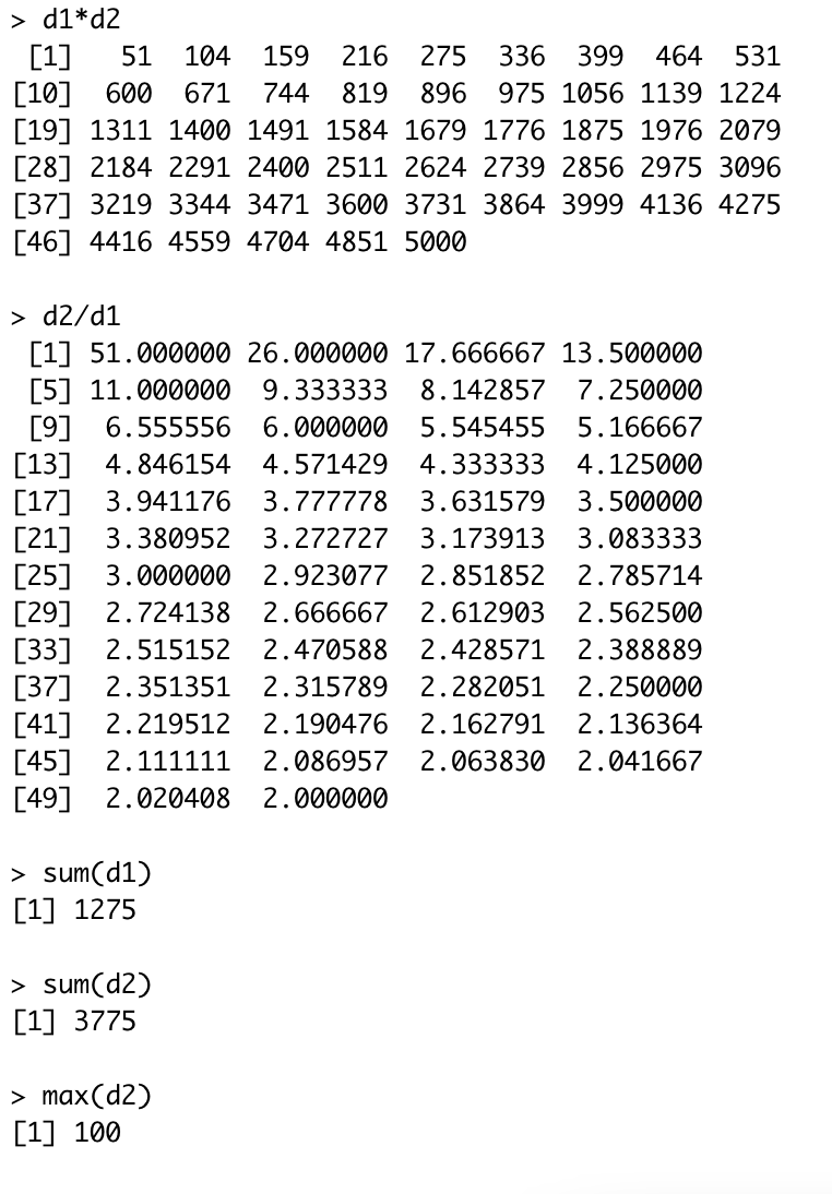 11. 벡터 d1, d2가 다음과 같을 때 각 문제를 수행하기 위한 코드를 작성하고 답을 구하시오.