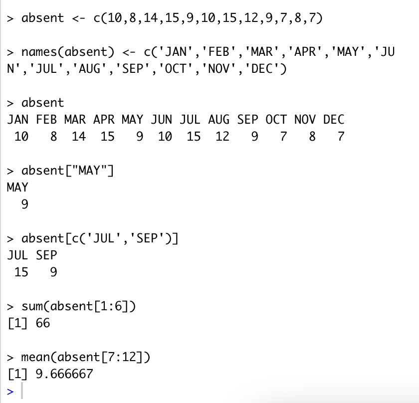 10. 월별 결석생 수 통계가 다음과 같을 때 이 자료를 absent 벡터에 저장하시오(결석생 수를 값으로 하고, 월 이름을 값의 이름으로 한다).
