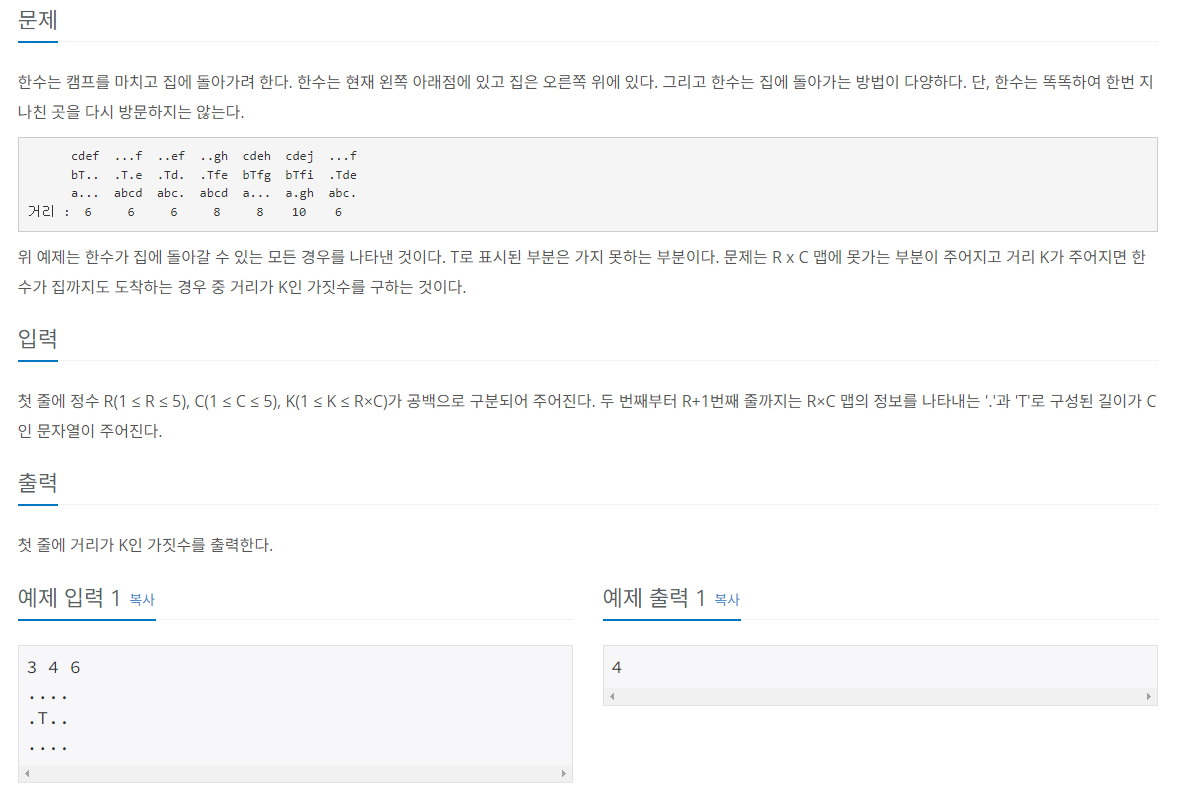 첫 줄에 정수 R(1 ≤ R ≤ 5), C(1 ≤ C ≤ 5), K(1 ≤ K ≤ R×C)가 공백으로 구분되어 주어진다. 두 번째부터 R+1번째 줄까지는 R×C 맵의 정보를 나타내는 '.'과 'T'로 구성된 길이가 C인 문자열이 주어진다