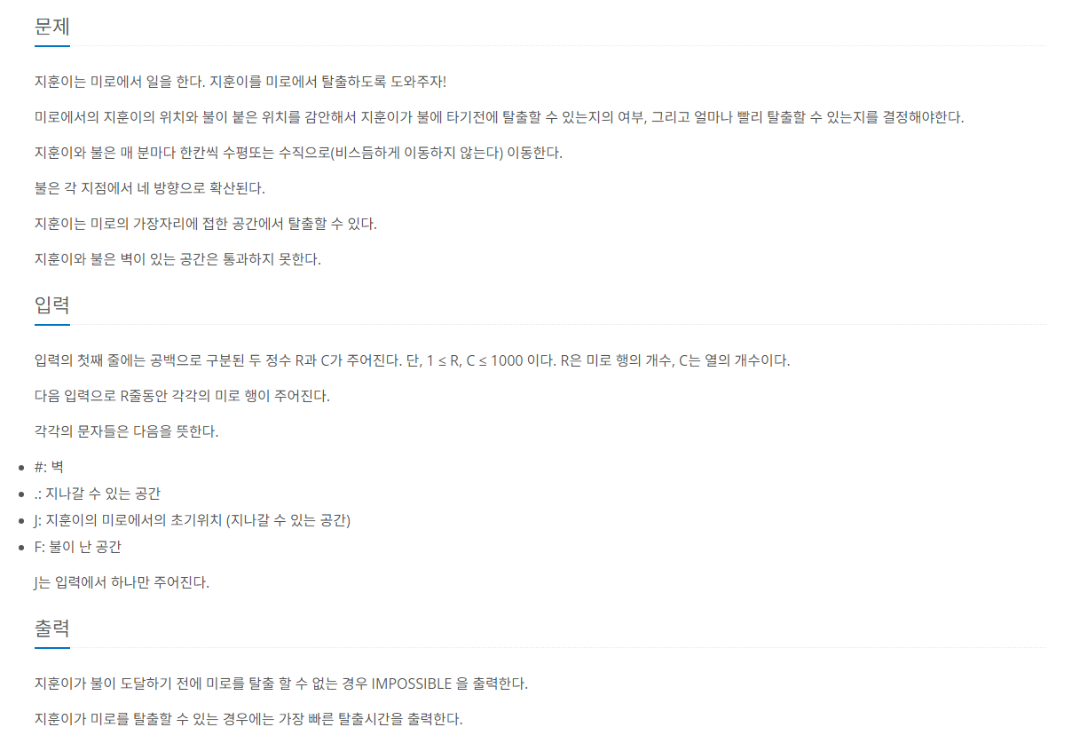 bfs심화문제이다. 지훈이가 4방탐색을 하며 지도밖을 나갈 경우 반복문이 종료되는 것까지를 구현하는것은 약간만 생각하면 할 수 있다. 하지만 다른문제와 다른것은 지훈이가 4방탐색을함과 동시에 불도 4방으로 퍼져나간다는것을 생각해야 한다. 나는 이부분에서 막혀서 다른글을 참고했다.