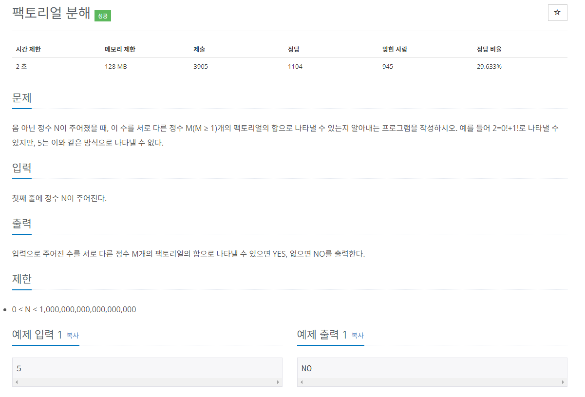 음 아닌 정수 N이 주어졌을 때, 이 수를 서로 다른 정수 M(M ≥ 1)개의 팩토리얼의 합으로 나타낼 수 있는지 알아내는 프로그램을 작성하시오. 예를 들어 2=0!+1!로 나타낼 수 있지만, 5는 이와 같은