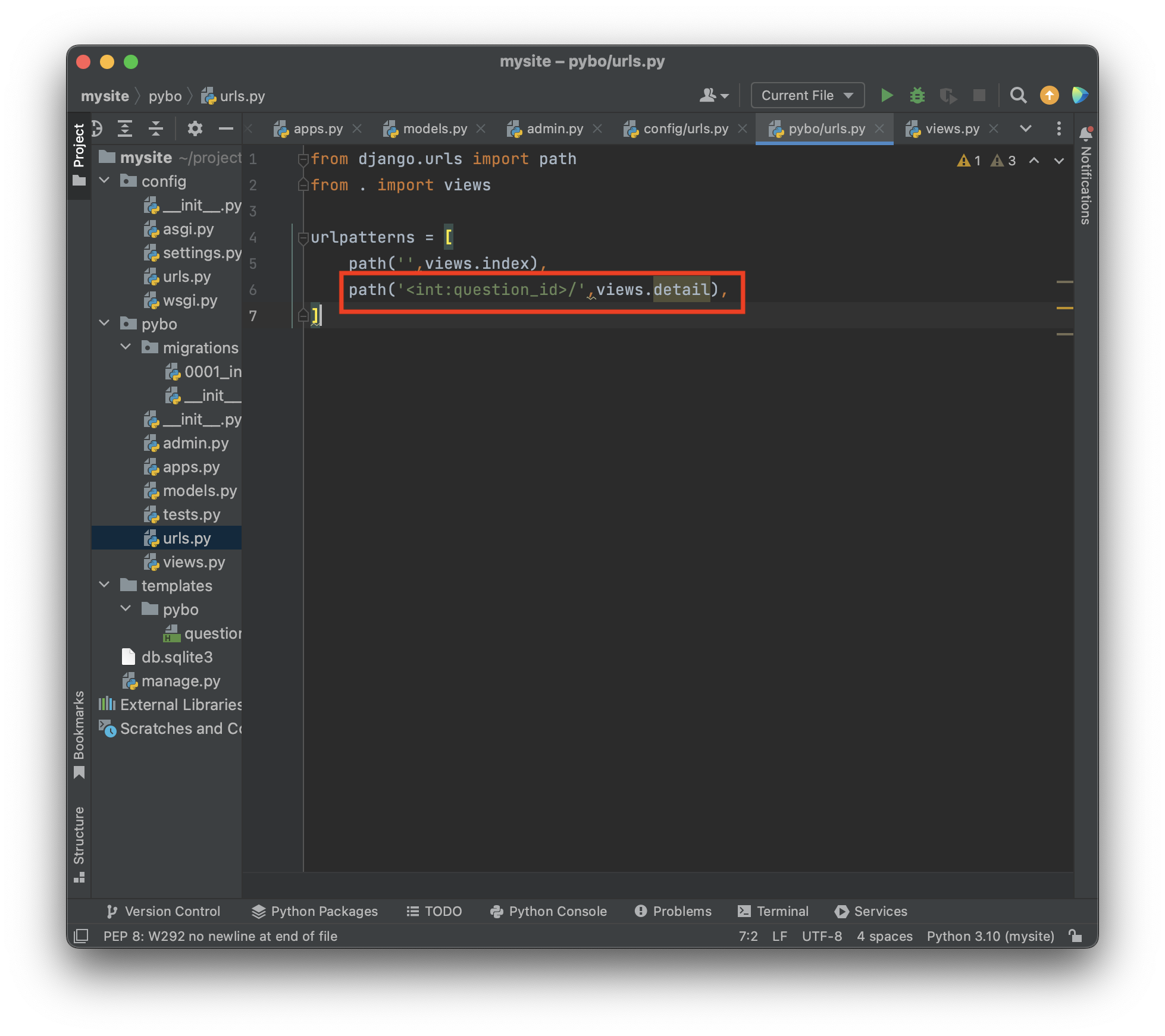 저 URL 의 의미는 id 값이 2 인 Question 을 상세 조회한다는 뜻이다. 이 URL 이 작동할 수 있도록 pybo/urls.py 파일을 수정하자.