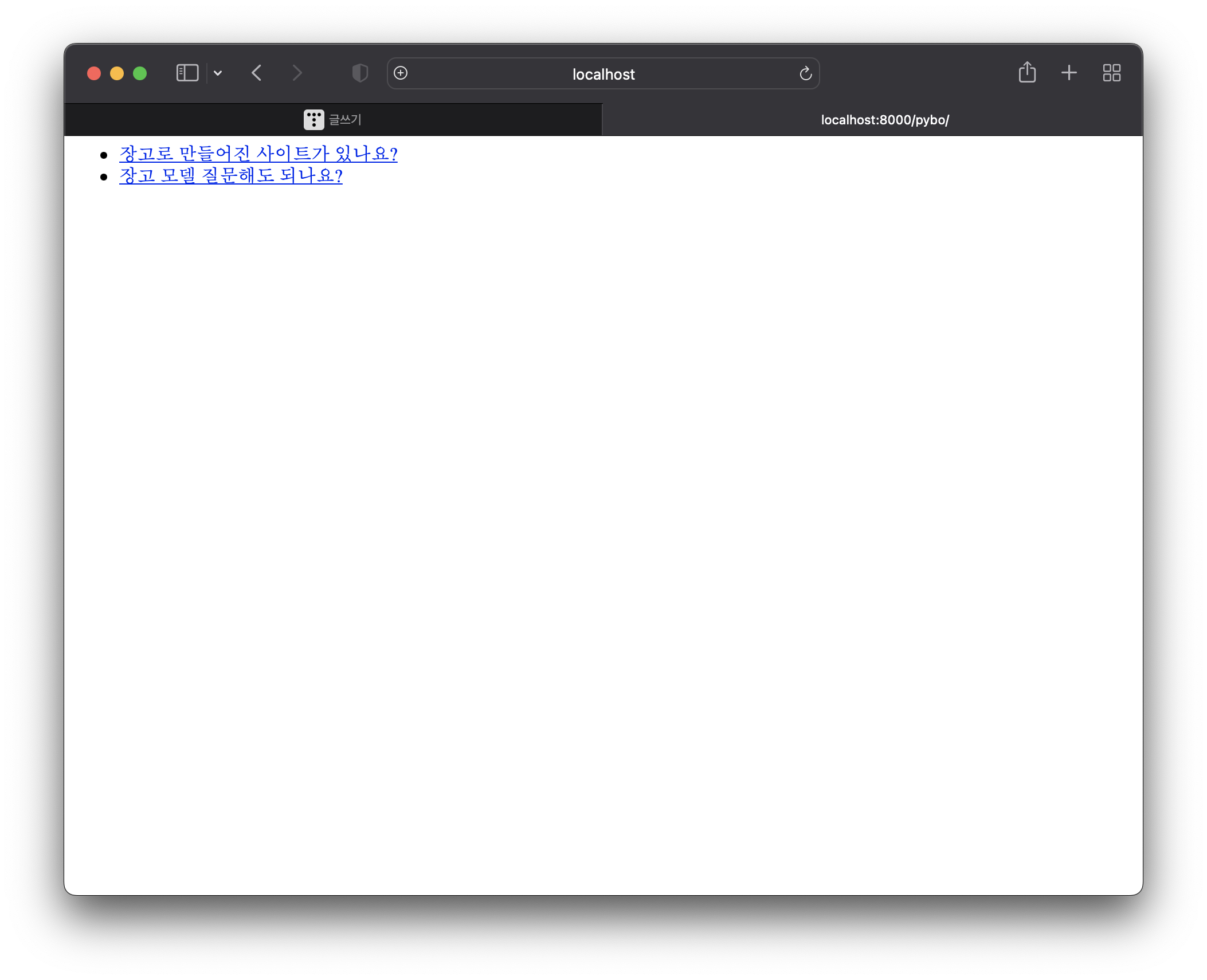 여기까지 수정하고 로컬 서버를 재시작 후 http://localhost:8000/pybo/ 페이지를 요청하면 다음과 같은 화면이 나온다.