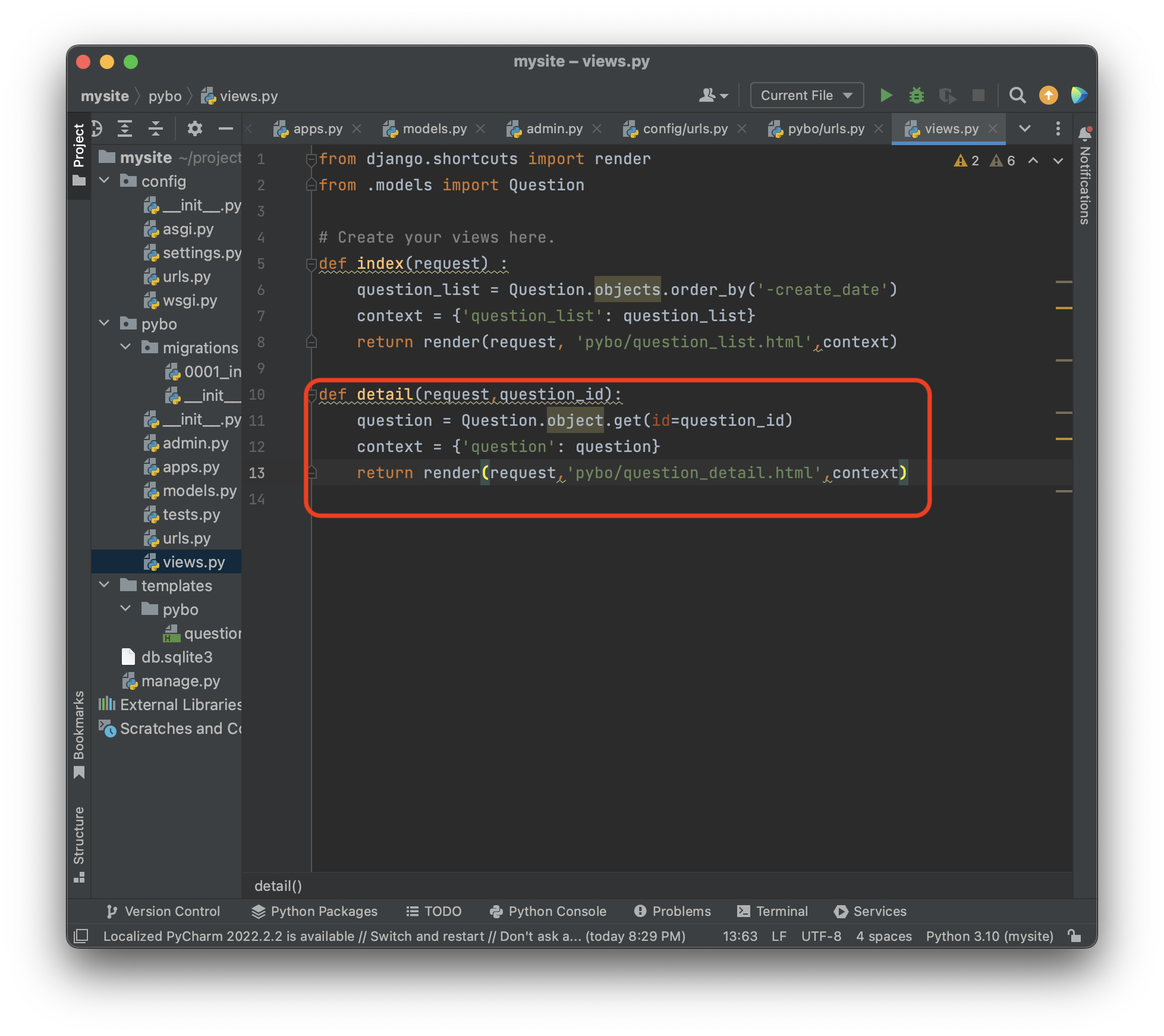 이제 위의 URL 매핑 규칙에 의해 실행되는. views.detail 함수를 만들어야 한다. pybo/views.py 파일에 detail 함수를 추가하자.