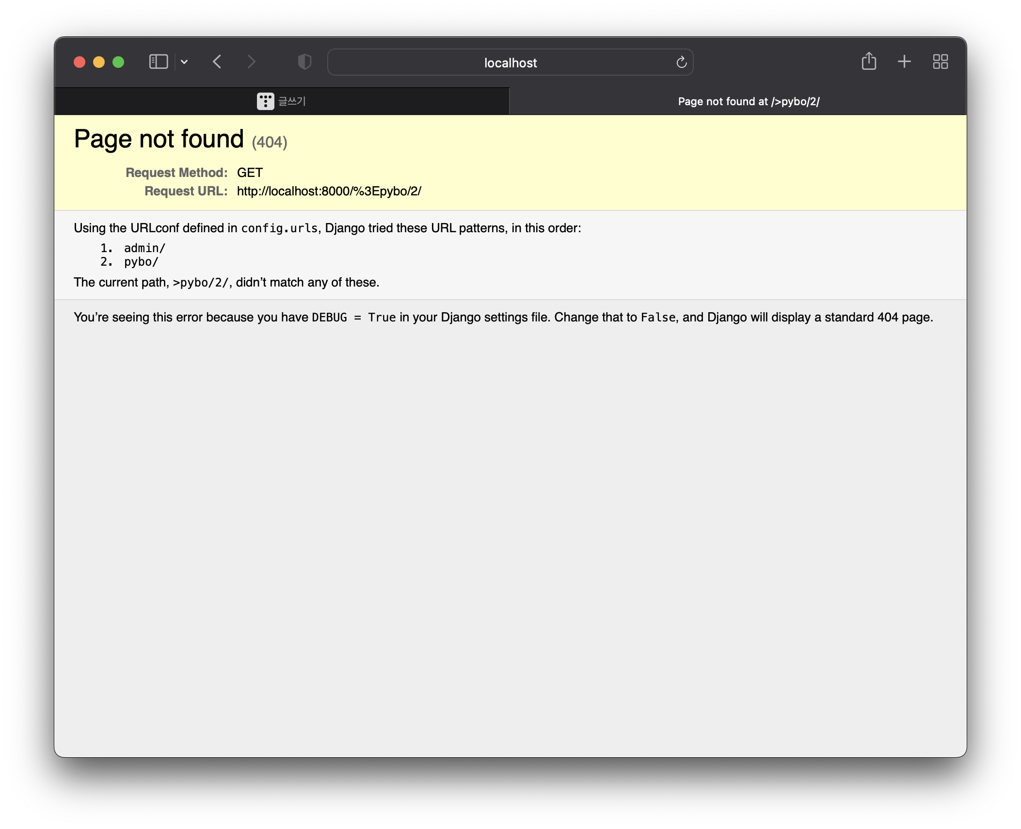 이러한 오류가 나온다. http://localhost:8000/pybo/2/ 에 대한 URL 매핑이 아직 없기 때문이다.