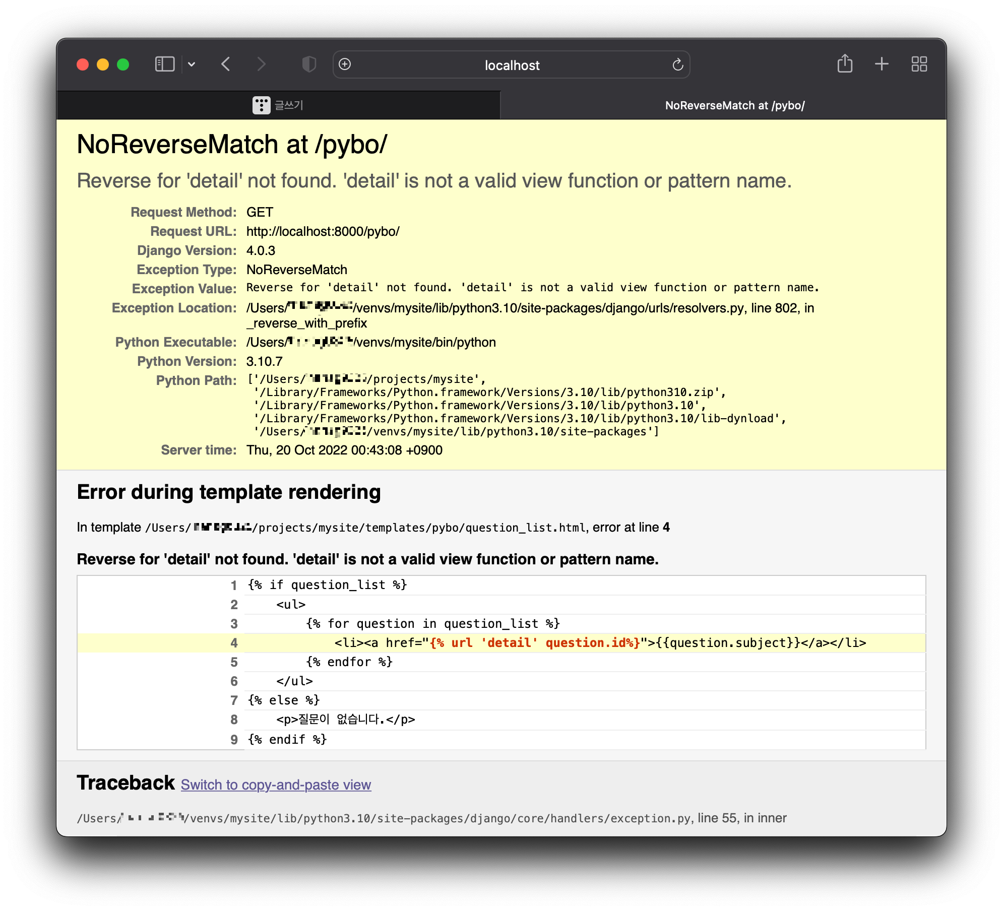 이런 오류가 발생한다. 이 오류는 네임스페이스를 추가했기 때문이다. 이 오류를 해결하려면 템플릿에서 사용한 URL 별칭에 네임스페이스를 다음과 같이 지정해야한다.