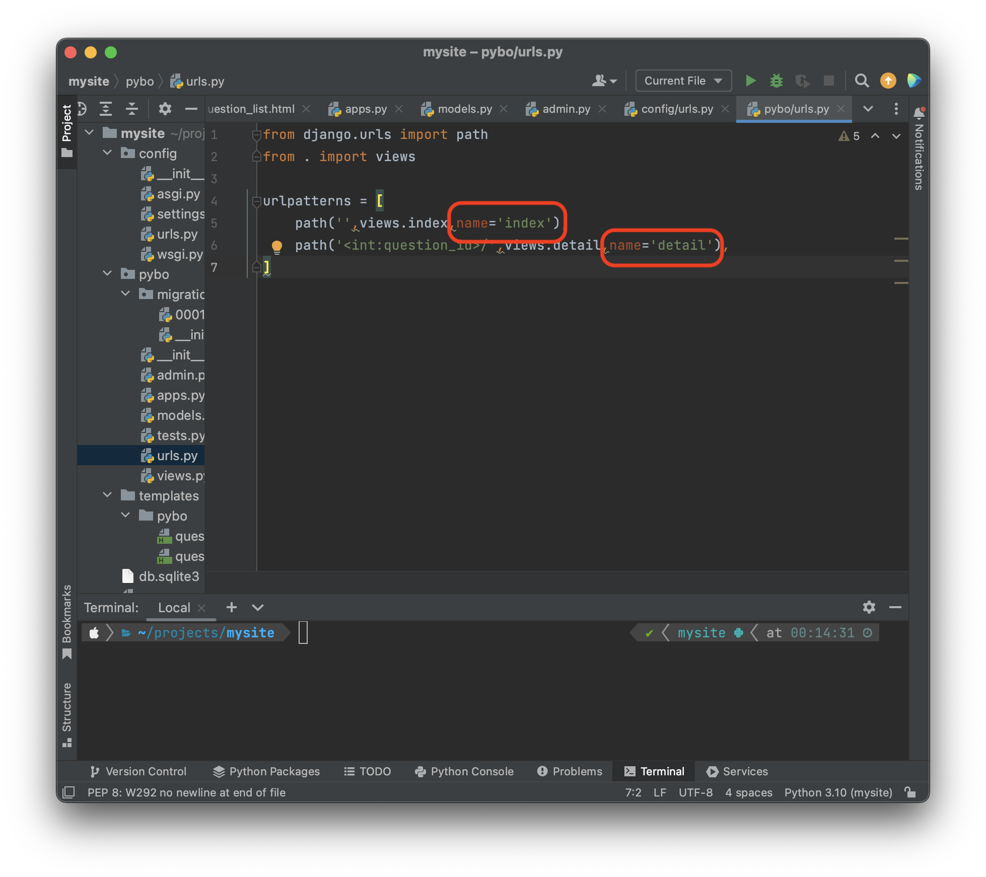 링크의 주소 대신 별칭을 사용하려면 URL 매핑에 name 속성을 부여해야한다. pybbo/urls.py 파일을 수정하자.
