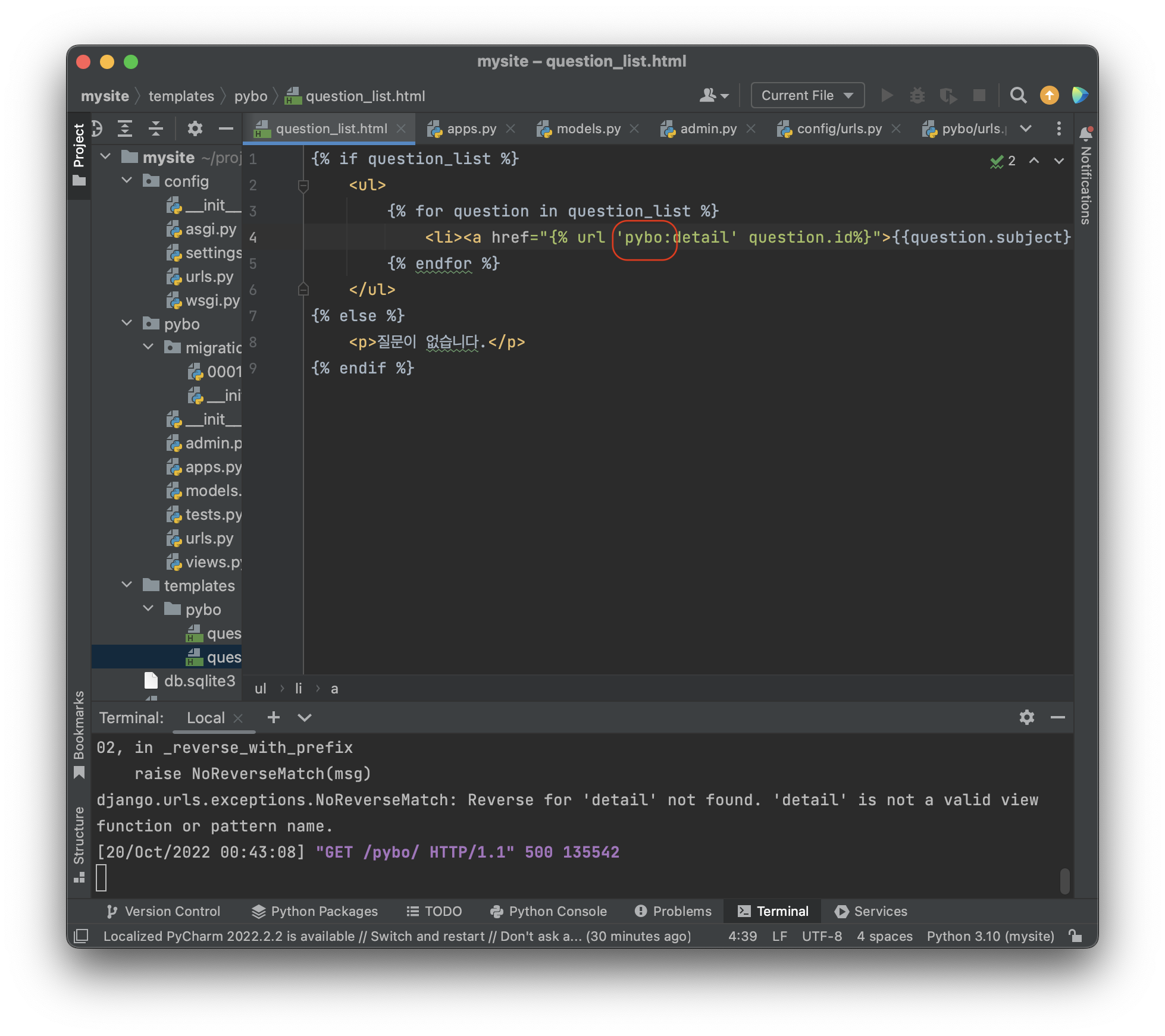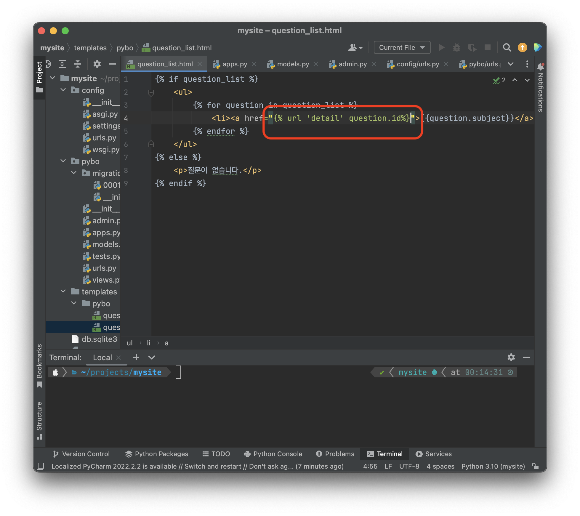 하드코딩 되어 있던 /pybo/{{ question.id }} 링크를 {% url 'detail' question.id %} 로 변경했다. 여기서 question.id 는 URL매핑에 정의된 <int:question_id>에 전달해야 하는 값을 의미한다.