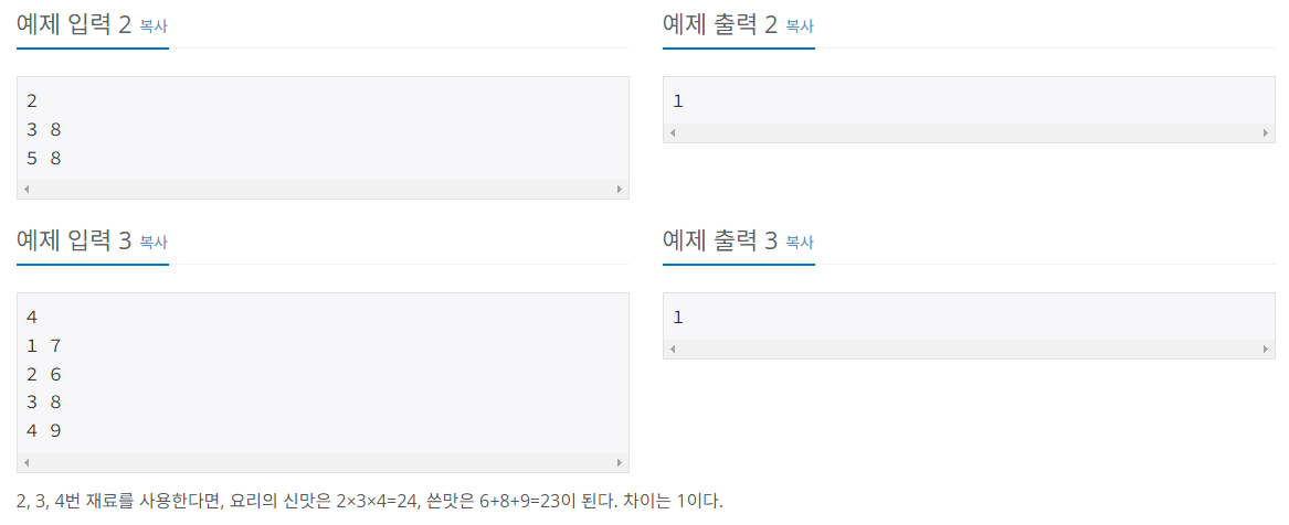solve(depth + 1, sour * ingredient[depth][0], bitter + ingredient[depth][1], selectedCount + 1); // 선택