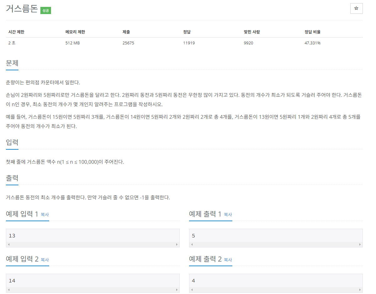 5원을 거슬러줄때랑 2원을 거슬러줄때랑을 둘 다 고려해야함