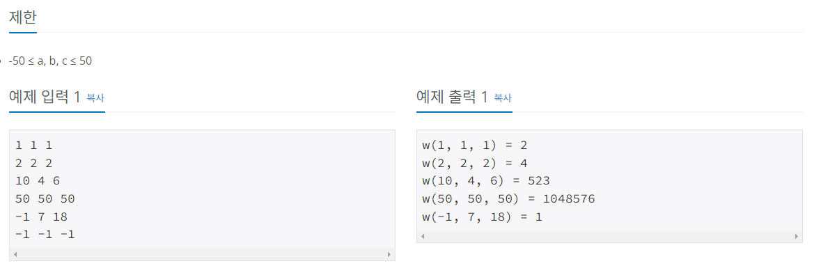bw.write("w(" + a + ", " + b + ", " + c + ") = " + w(a, b, c) + "\n");