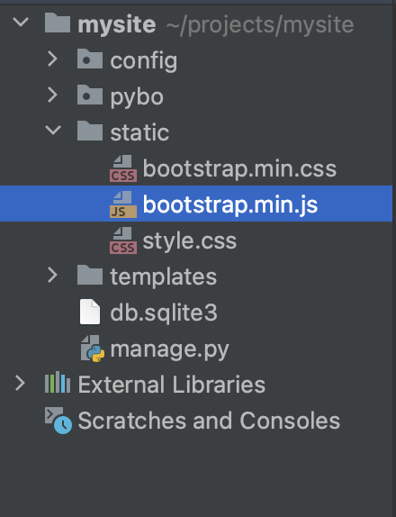 bootstrap-5.1.3-dist\js\bootstrap.min.js 파일을 projects\mysite\static\bootstrap.min.js 로 옮겨주자.