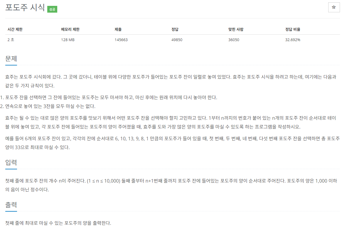 - dp[1]은 첫 번째와 두 번째 잔을 마시는 경우입니다.