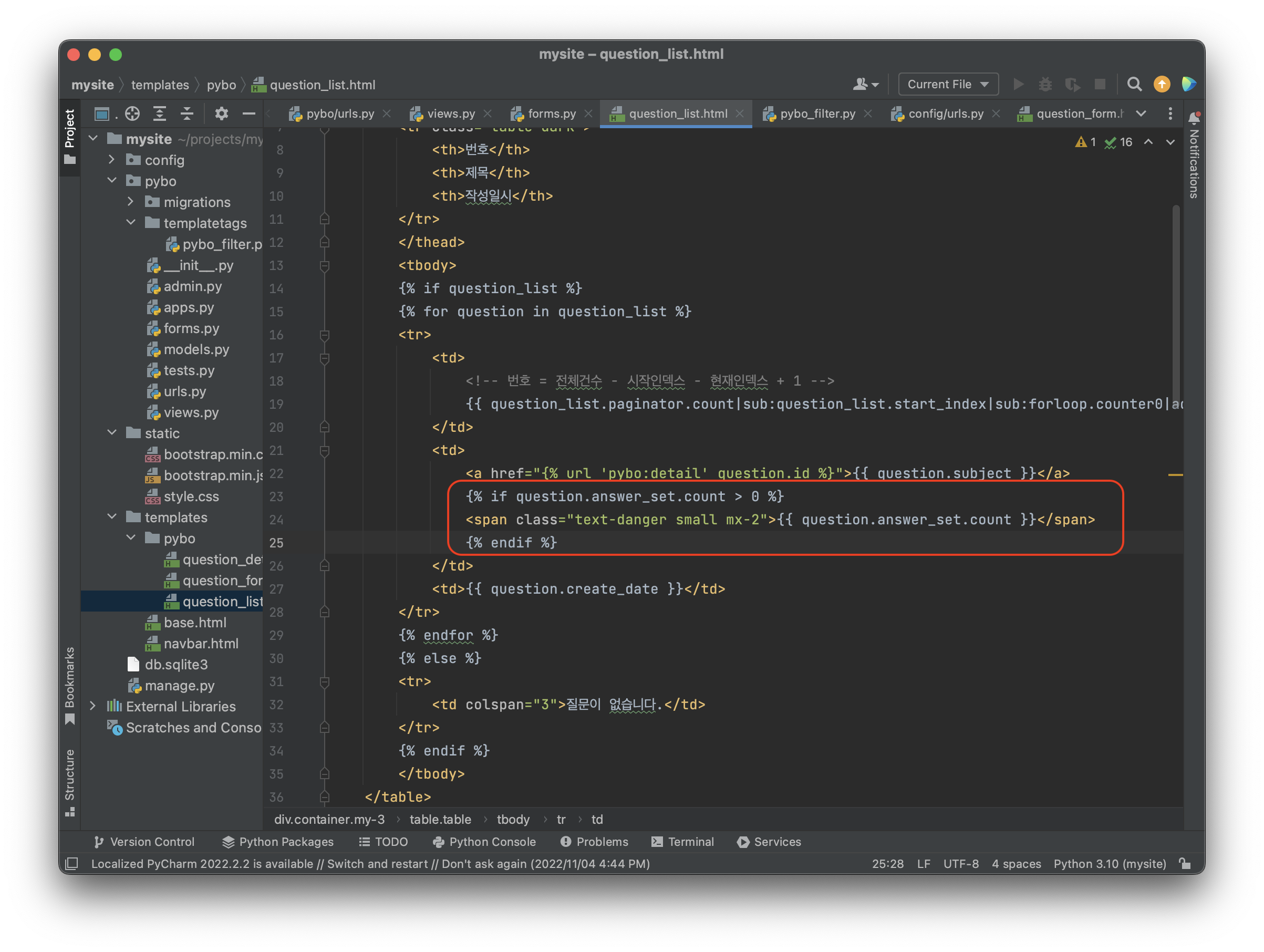 {% if question.answer_set.count > 0 %} 로 답변이 있는 경우를 검사하고, {{ question.answer_set.count }} 로 답변 개수를 표시했다. 잘 적용되었는지 서버를 시작해서 확인해보자.