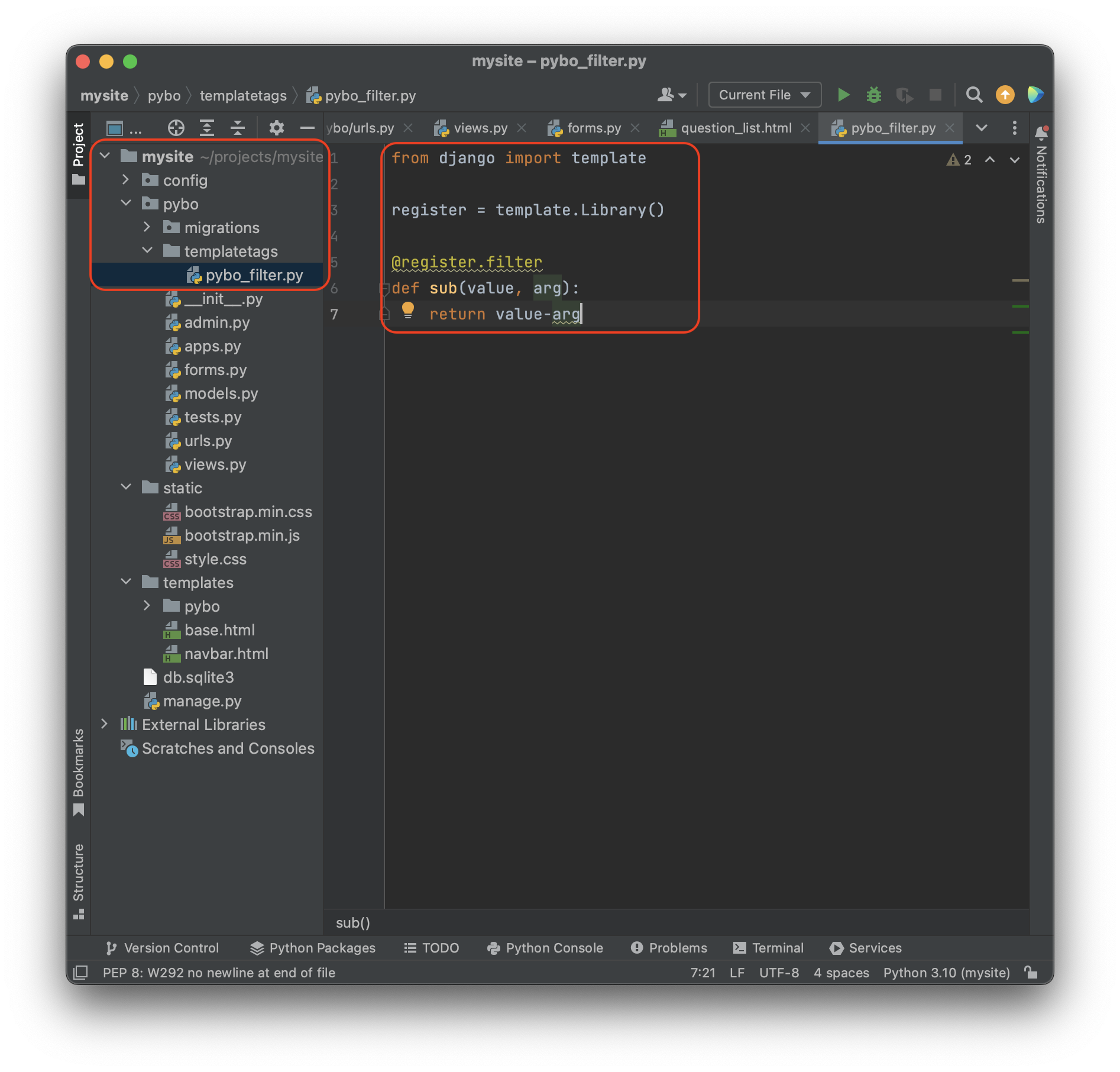 템플릿에서 이 공식을 적용하려면 빼기 기능이 필요하다. 앞에서 사용한 더하기 필터 |add:5 처럼 빼기 필터 |sub:3 를 쓰면 될것같지만 빼기필터는 존재하지 않는다. 그래서 빼기 필터를 직접 만들어야 한다.