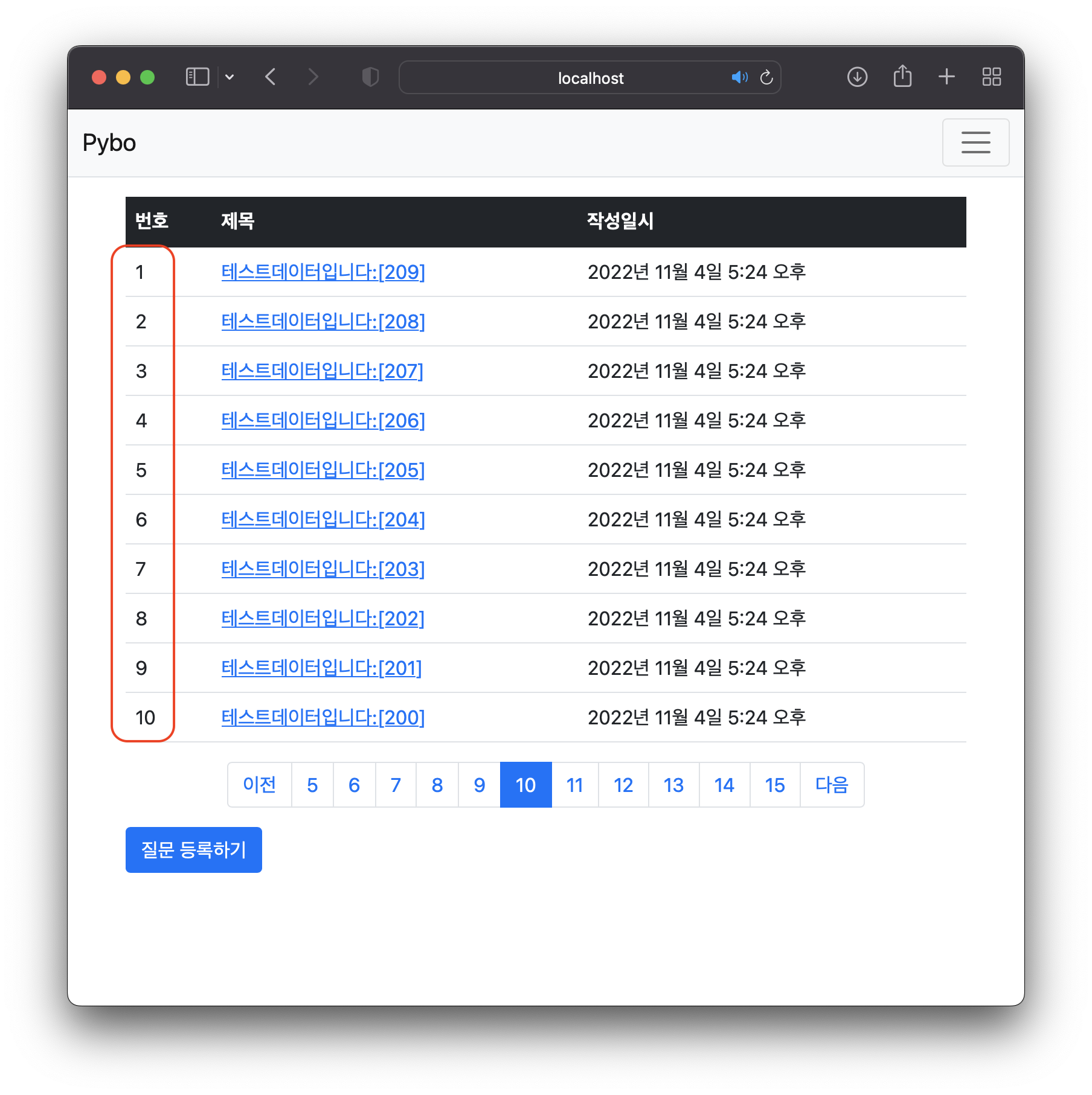 게시물의 번호를 보면 1부터 시작하는데 어느 페이지를 가도 게시물 번호가 1번부터 시작한다. 사진의 페이지는 10페이지인데 게시물번호는 1번부터 시작하는것을 볼 수 있다.