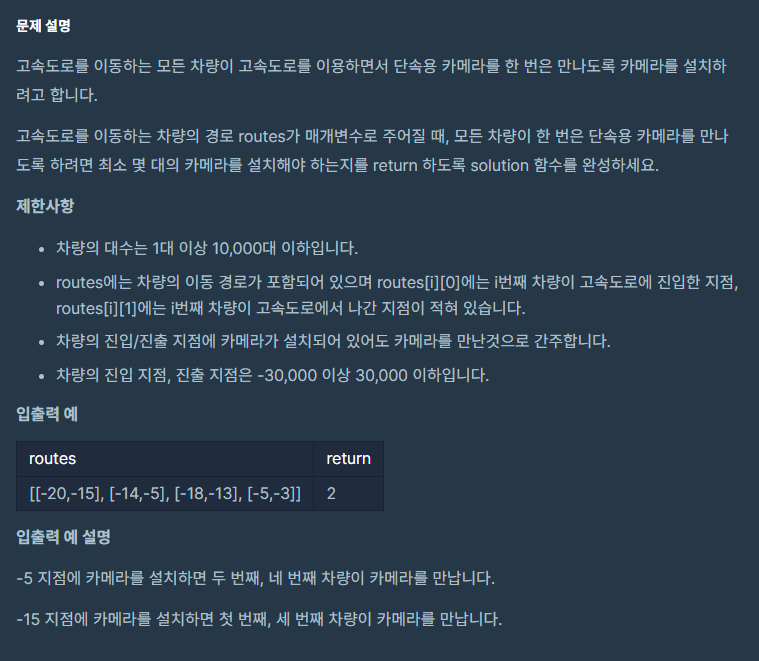 이 문제를 해결하기 위해 그리디 알고리즘을 사용합니다. 핵심 아이디어는 차량의 진출 지점을 기준으로 정렬한 후, 가장 많은 차량이 겹치는 곳에 카메라를 설치하는 것입니다.