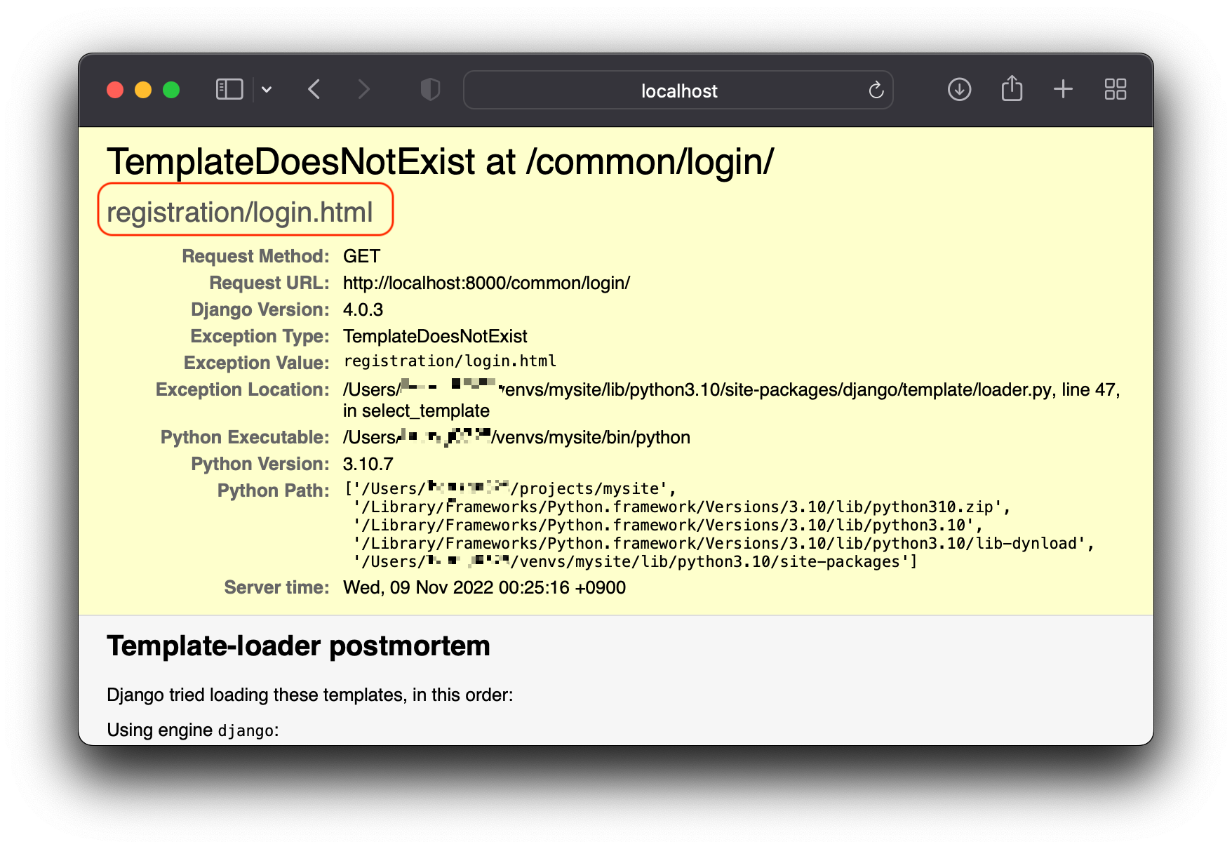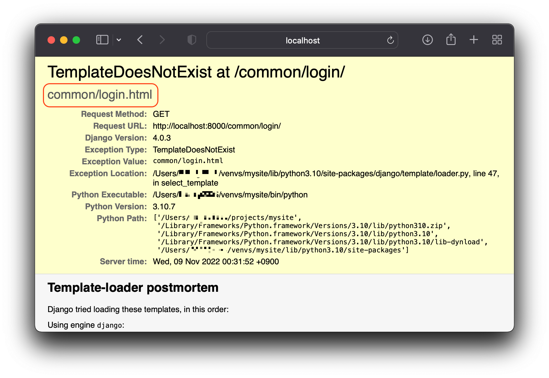 오류 내용이 수정된것을 볼 수 있다. 오류 내용을 보면 알 수 있듯이 이젠 common/login.html 이 없다는 오류다.