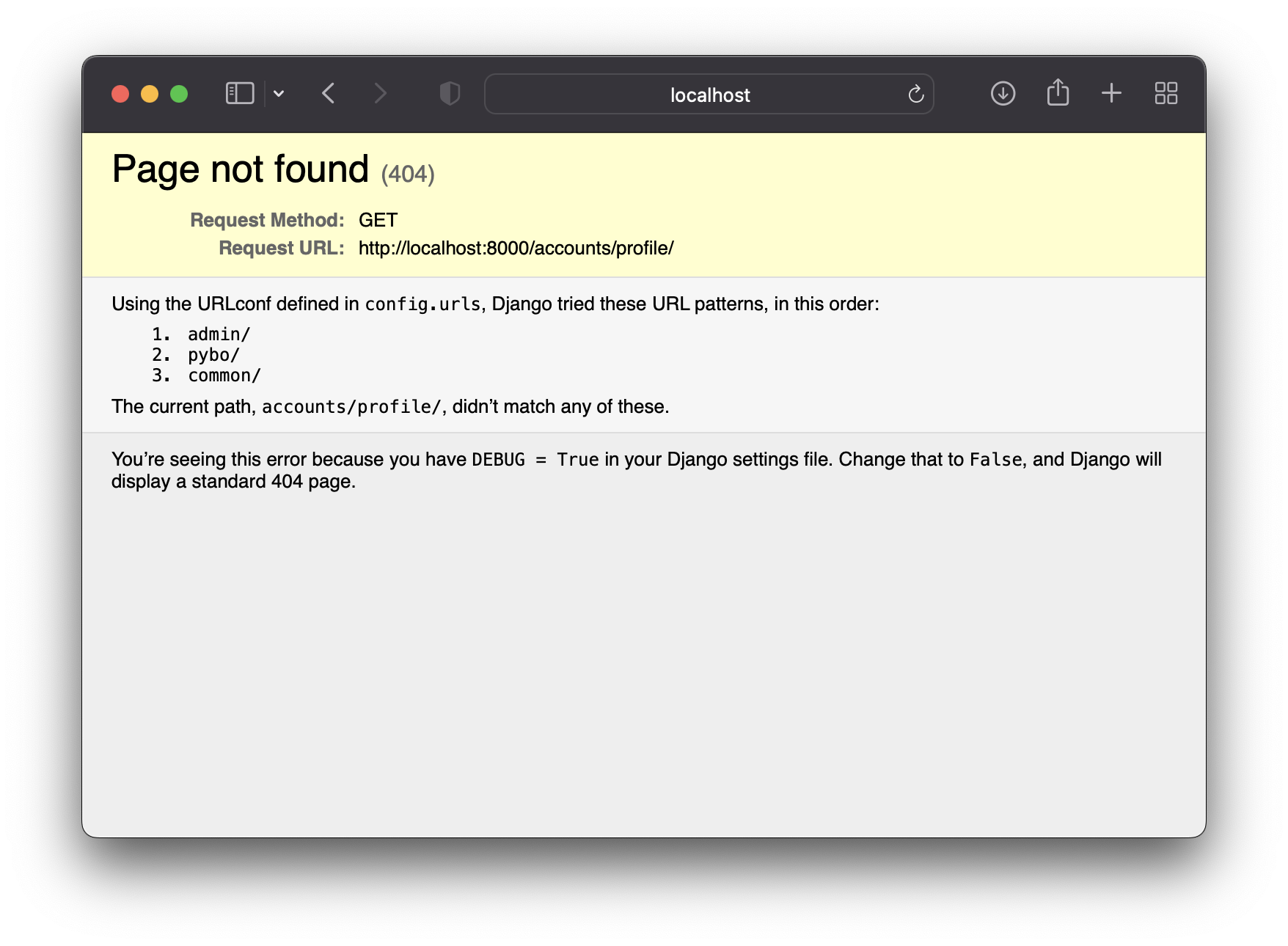 로그인에 성공하면 오류가 나온다. 오류메세지를 보면 알수있듯이 로그인에 성공해 http://localhost:8000/accounts/profile/ 로 가야하는데 아직 해당 페이지가 구성되어있지 않기 때문이다. 하지만 /accounts/profile/ 은 내가 파이보에 구성한 URL 구조와 맞지 않으므로 로그인 성공시 / 페이지로 이동할 수 있도록 projects\mysite\config\settings.py 를 다음과 같이 수정하자.
