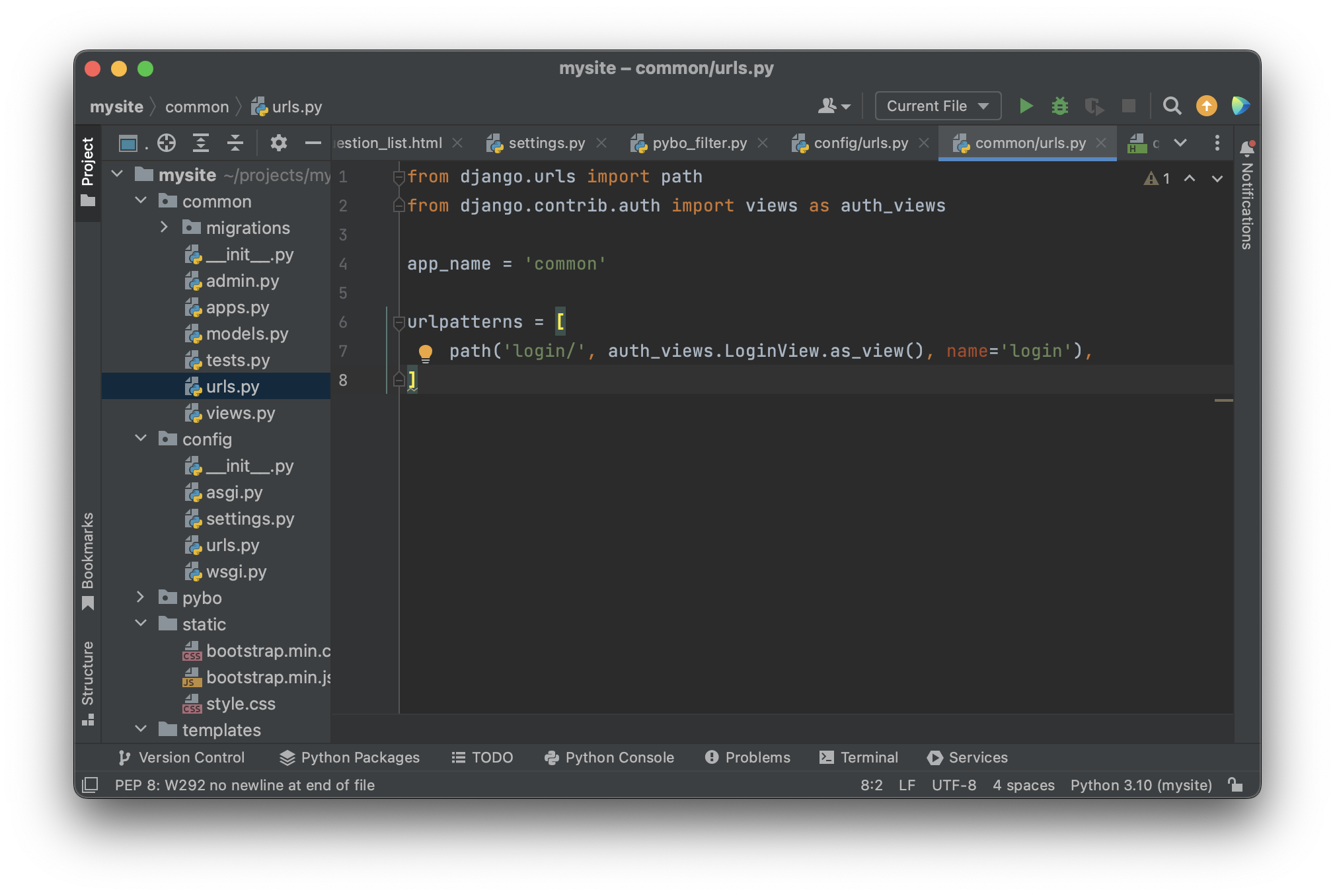 아직 common 앱에 어떤 기능도 구현하지 않았으므로 urlpatterns 는 빈상태로 놔두면 된다.