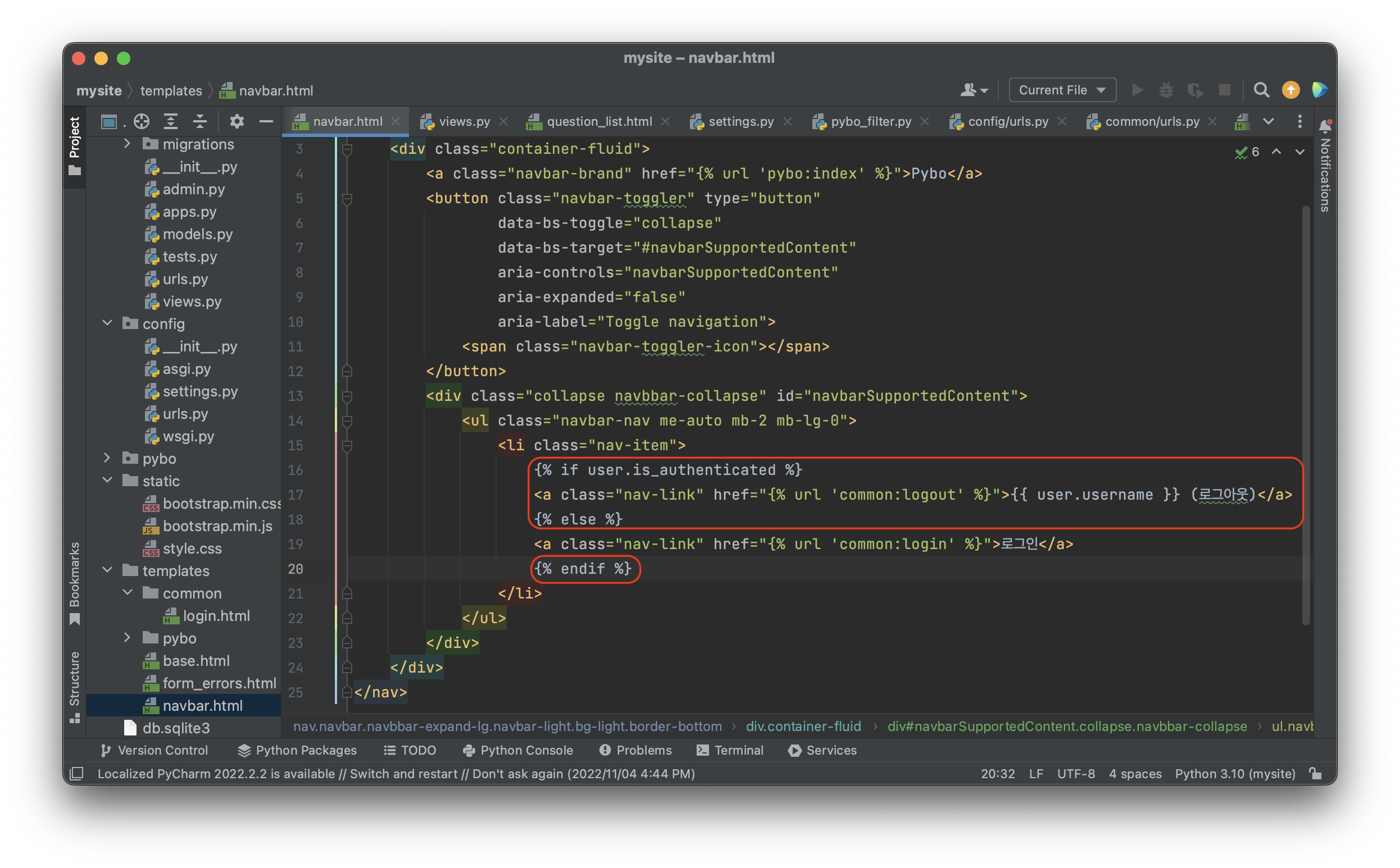 {% if user.is_authenticated %} 은 현재 사용자가 로그인 되어있는지를 판별한다. 로그인되어있는지를 판별하고 로그인 되어있으면 '로그아웃' 링크를 표시하고 아니면 '로그인' 링크를 표시한다. 로그인 상태에서는 로그아웃 링크에 사용자명을 의미하는 {{ user.username }} 도 추가로 표시한다.