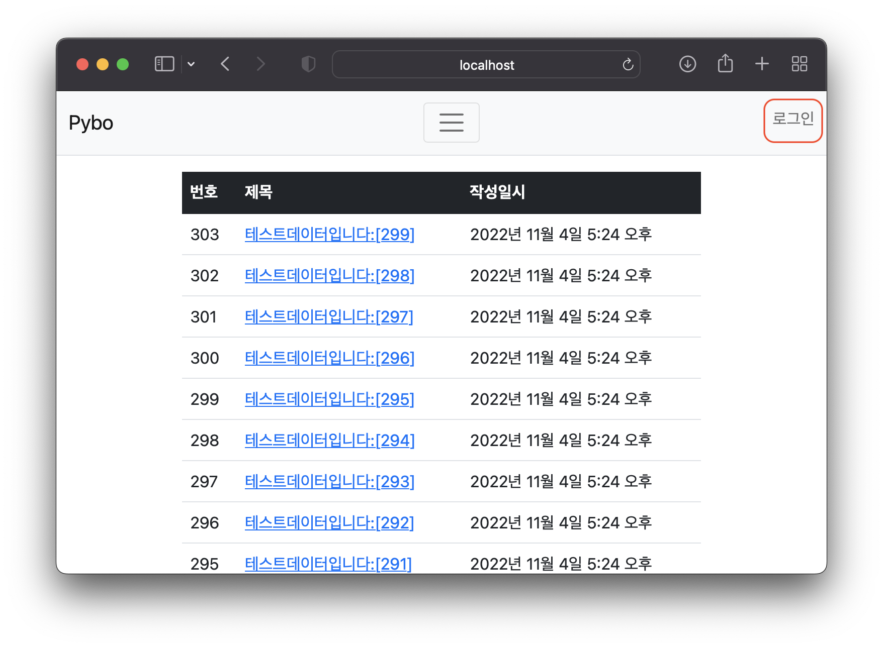 이제 로그인에 성공하면 정상적으로 작동한다. 하지만 로그인을 했음에도 로그인 버튼이 로그아웃버튼으로 바뀌지 않고 여전히 로그인 버튼으로 남아있다. 이를 해결하기위해 proejcts\mysite\templates\navbar.html 을 다음과 같이 수정하자.