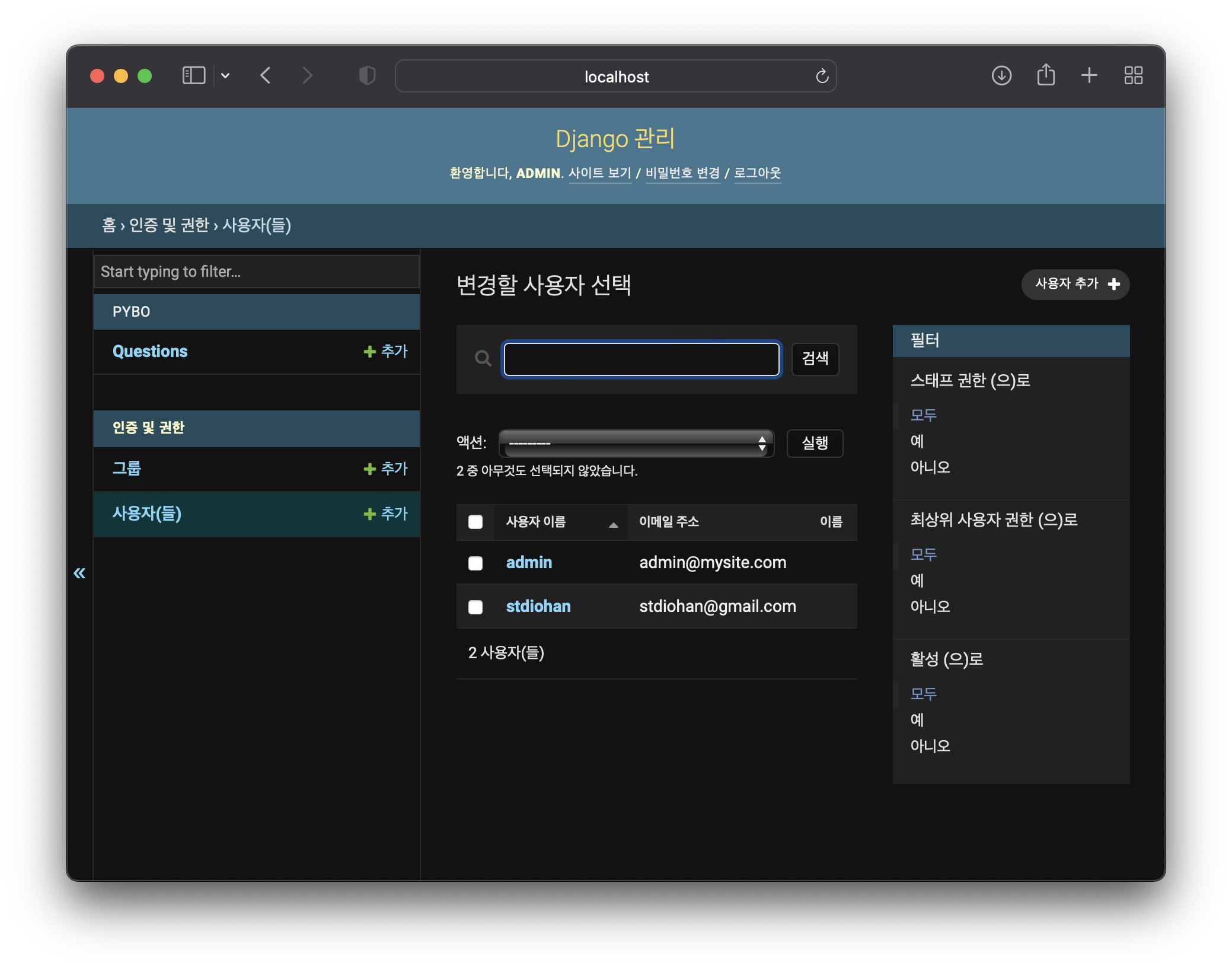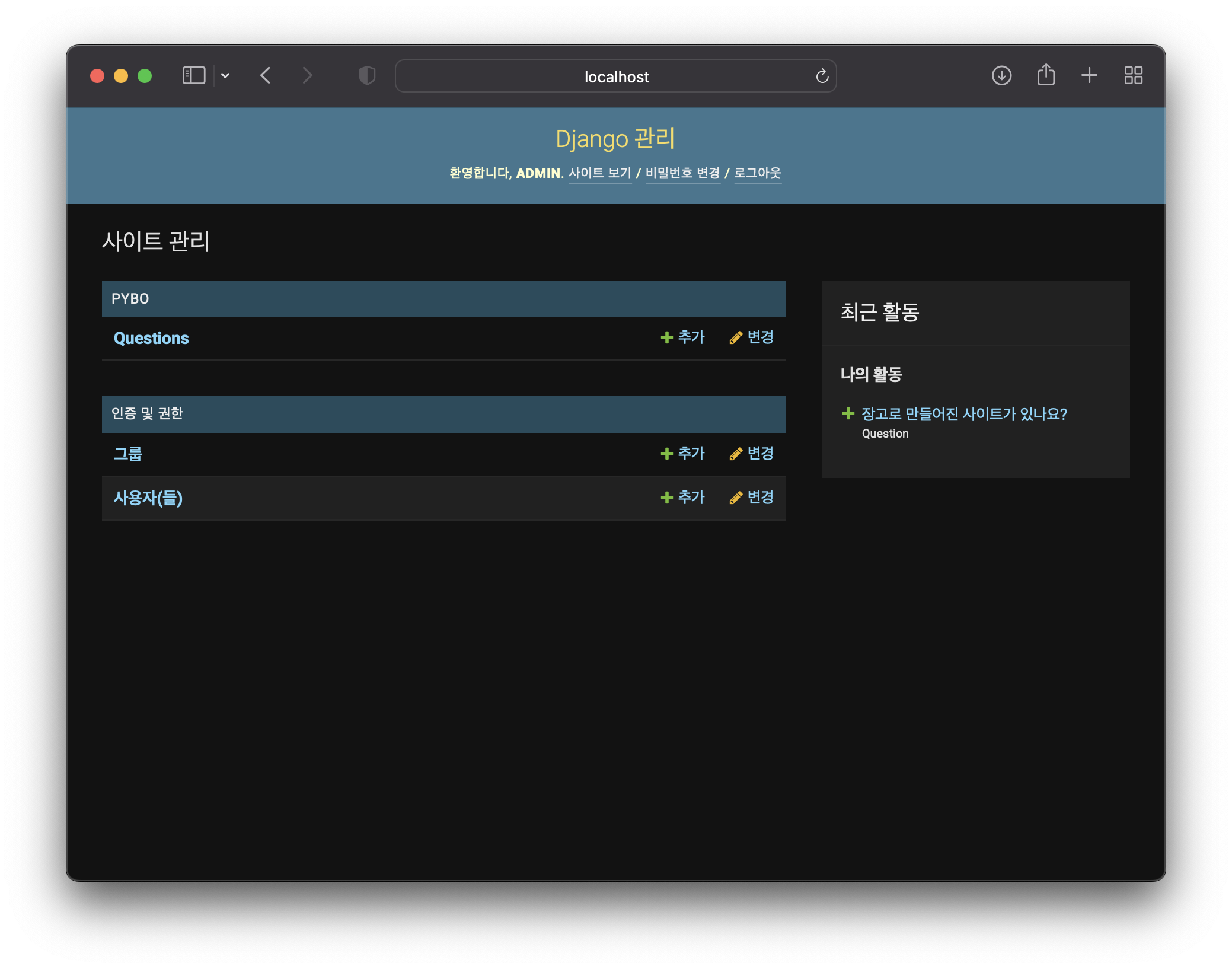이런 경고 메세지가 나온다. 어드민 페이지는 슈퍼유저로 접속해야한다. 저번에 만든 아이디 admin 비밀번호 1111 로 로그인해 보면