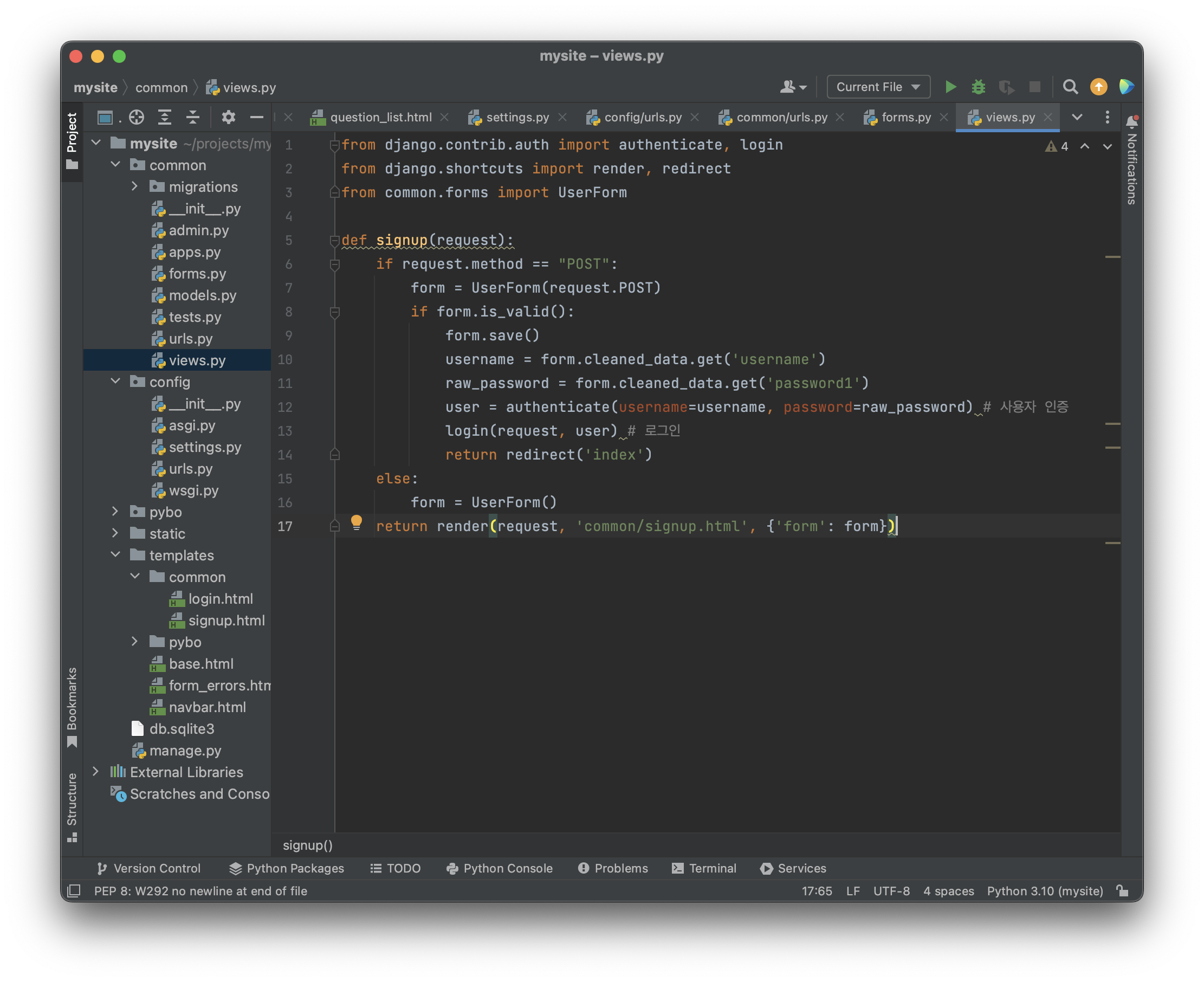 이제 아까 만들어야했던 views.signup 함수를 작성하자. projects\mysite\common\views.py 파일에 다음과 같이 작성하자.
