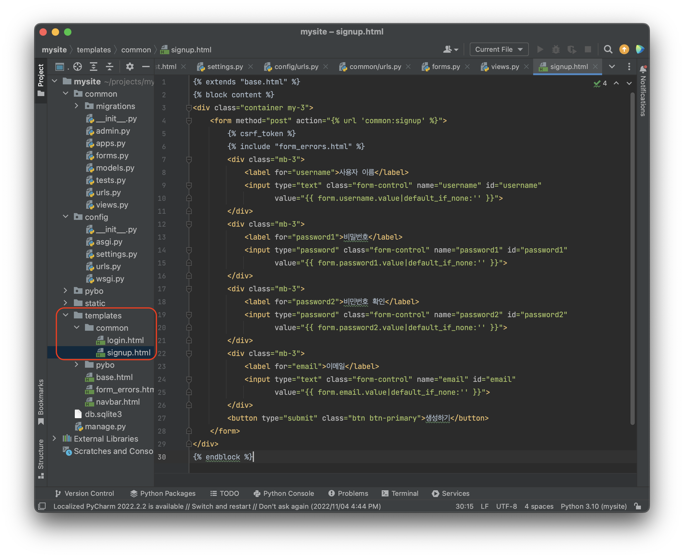 회원가입 링크를 누르면 views.signup 함수가 실행된다. 이제 이 함수를 만들어 줘야하지만 그 전에 일단 계정생성시 사용할 UserForm을 projects\mysite\common\forms.py 파일을 추가해 새로작성하자.