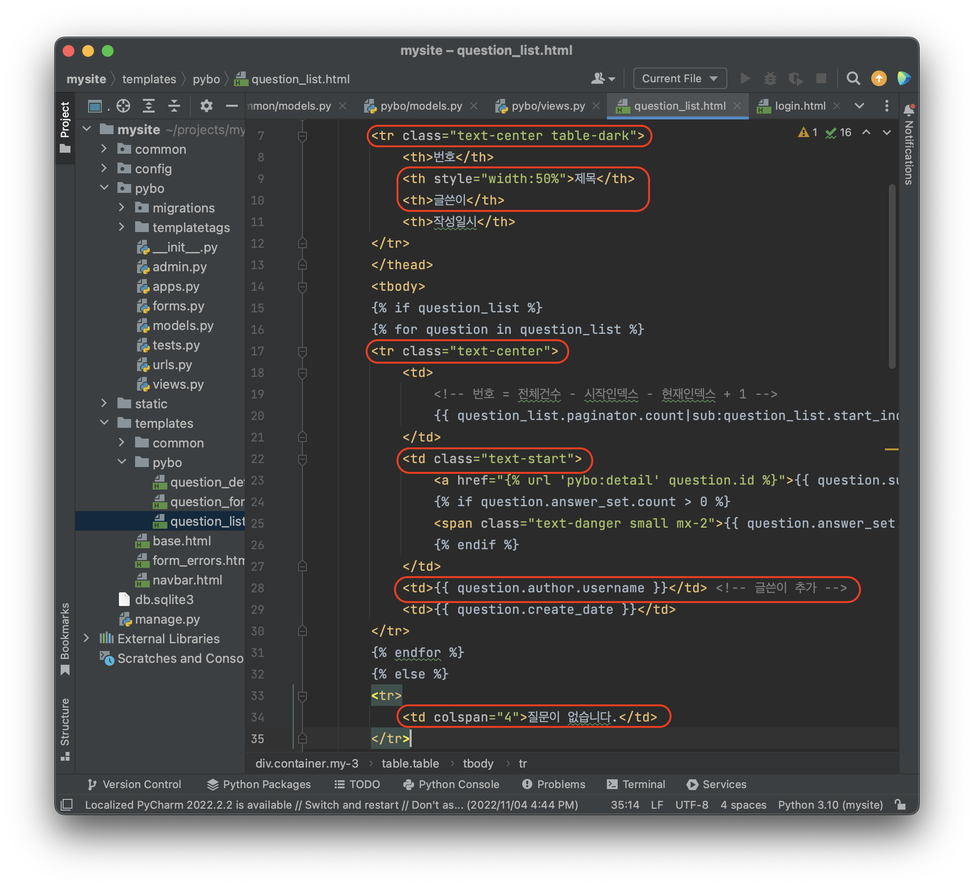 <th>글쓴이</th>로 항목을 추가하고 th 엘리먼트를 가운데 정렬하도록 tr 엘리먼트에 text-center 클래스를 추가하고, 제목의 너비가 전체의 50%가 되도록 style="width:50%" 를 지정했다. <td>{{ question.author.username }}</td> 를 추가해 질문의 글쓴이를 표시했다. 테이블 내용을 가운데 정렬하도록 tr 엘리먼트에 text-center 를 추가하고, 제목을 왼쪽 정하도록 td 엘리먼트에 text-start 클래스를 추가했다. 테이블 항목도 3개에서 글쓴이를 추가해 4개가 되었으므로 colspan 을 4로 수정했다. 테스트 해보자.