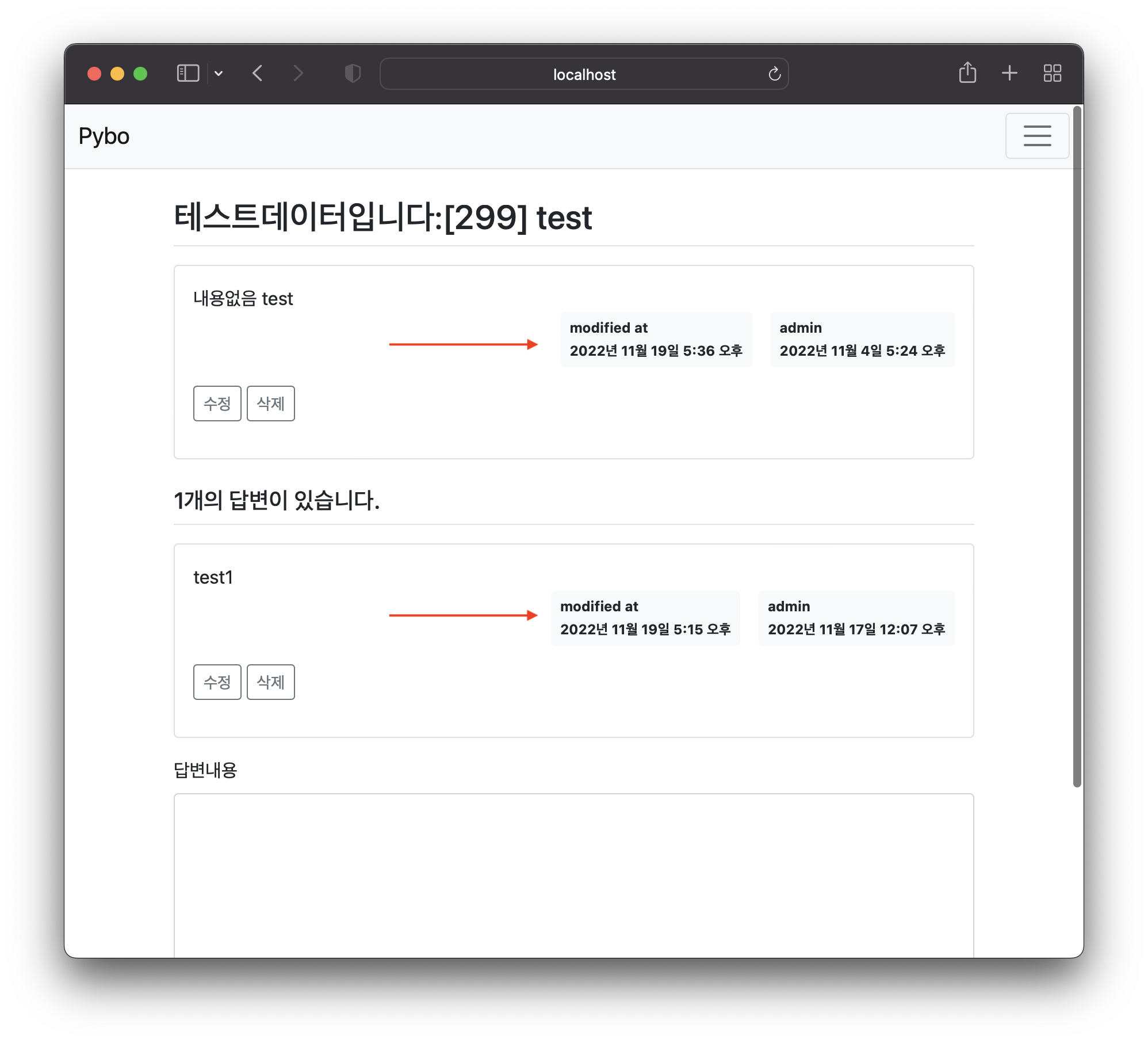 답변 수정도 질문 수정과 삭제 처럼 로그인한 사용자와 답변을 작성한 사용자가 같을 경우에만 수정 버튼이 나타난다.