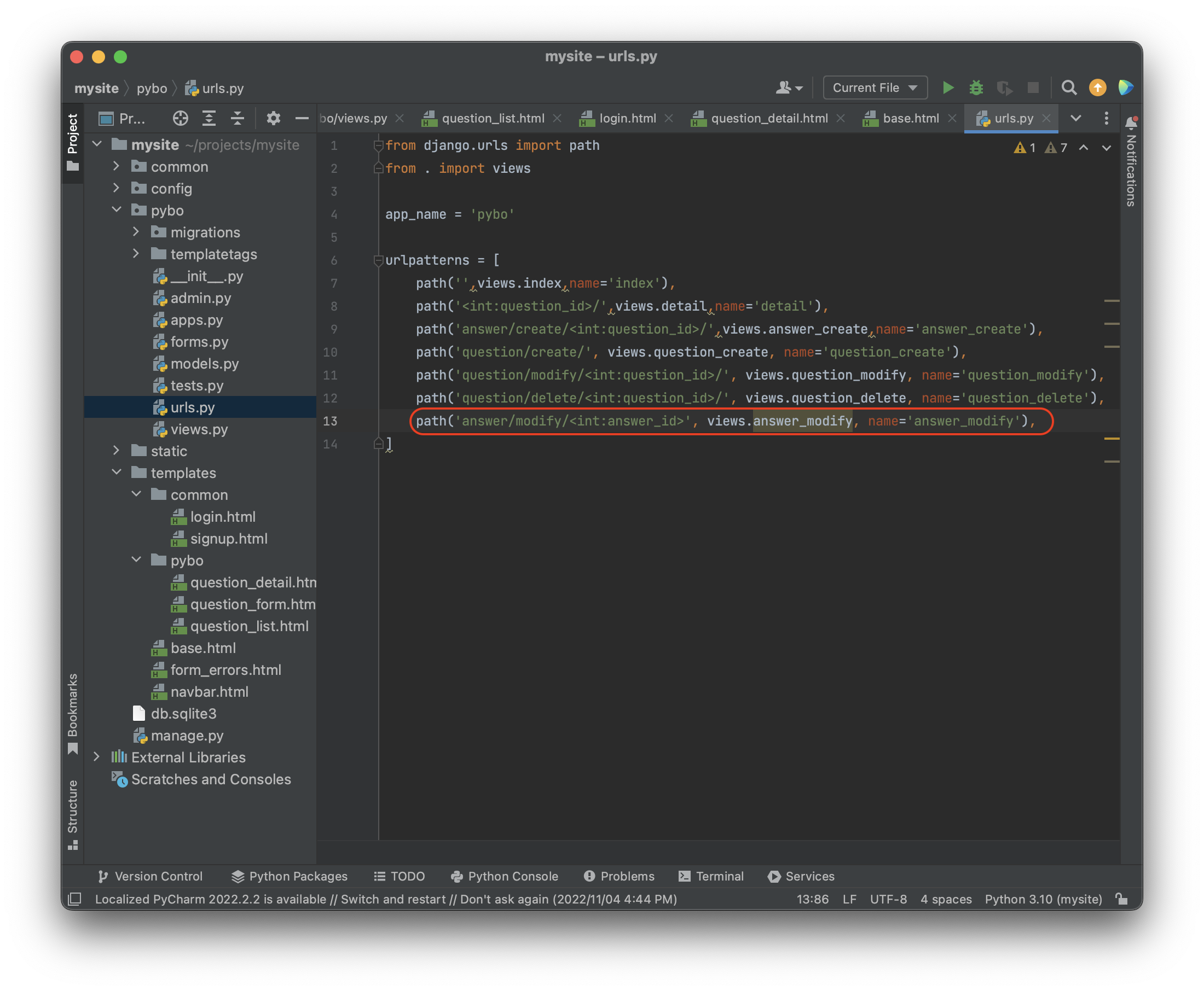 위에서 {% url 'pybo:answer_modify' answer.id %}가 추가되었기 때문에 pybo/urls.py 에 URL 매핑을추가하면 된다.