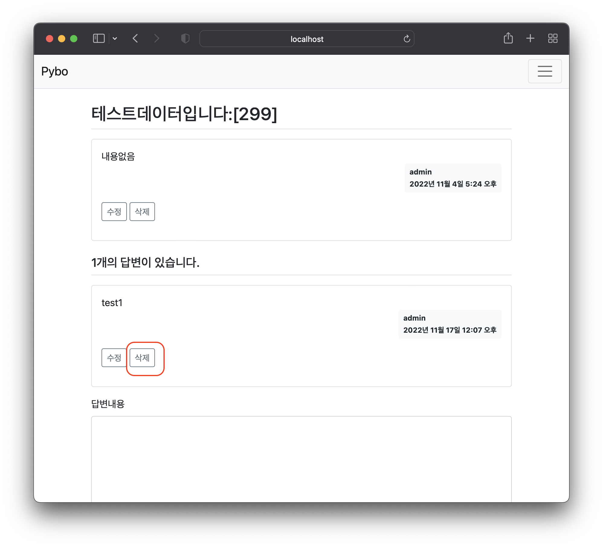 이제 로그인한 사용자와 답변 작성자가 같으면 삭제 버튼이 나온다.